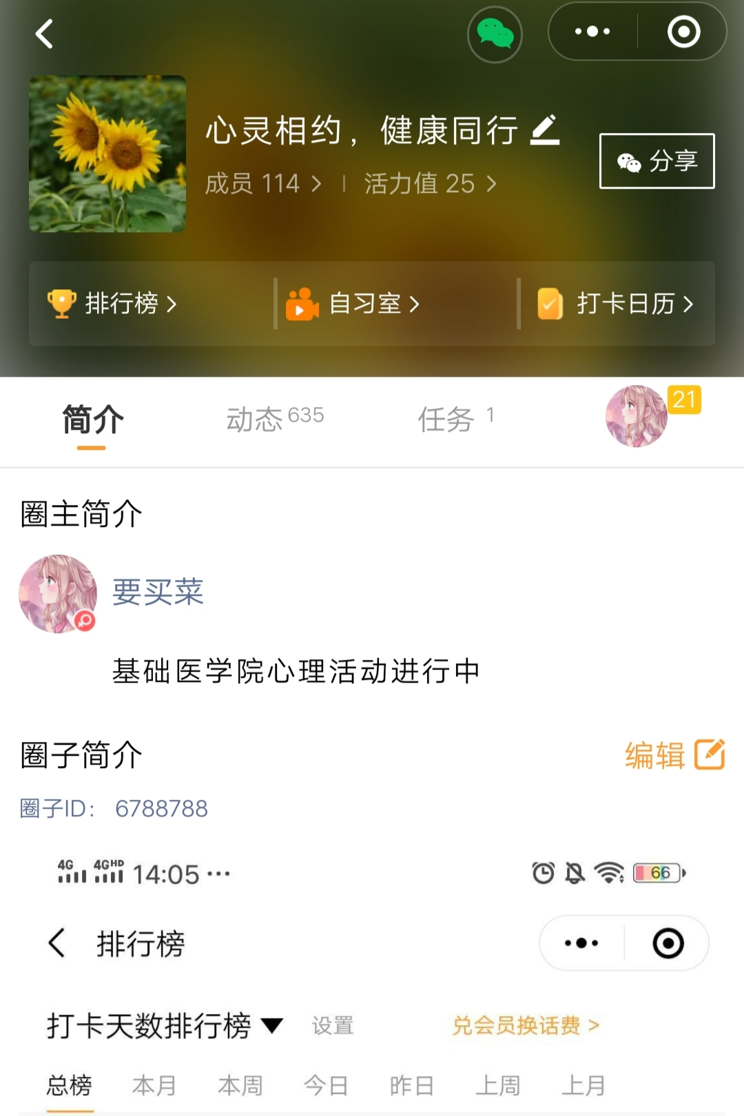 为充实研究生校园生活,增强心理健康意识,普及心理健康知识,促进大家养成良好的习惯,充满积极的能量,洋溢活泼的风采,近期,威廉体育williamhill采用线上微信小程序打卡方式举办了2021年“朋辈协力•心理成长”系列活动—— “心灵相约,健康同行”运动互动打卡活动。本次活动由研究生心理辅导员孙佳钰老师组织,朋辈心理辅导员赵鹤负责,全院研究生共同参加。
