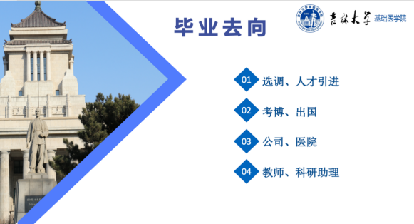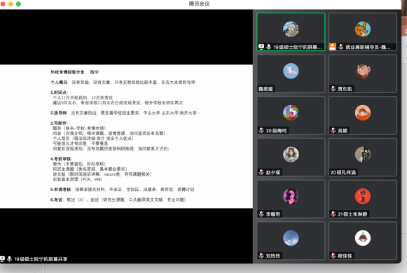 会上五位优秀研究生代表分别从升学、公考、企业、医疗事业单位四个方面为同学们带来干货满满的就业分享。考取山东大学博士的阮宁从个人概况、考博时间、选导师、考试形式等方面为大家分享了考博经验;签约江西定向选调的刘玲玲从选调生政策了解、招考一般流程、考试科目及成绩核算、笔试行测备考、笔试申论备考、面试备考等方面为大家分享了公招考试经验;签约著名药企药明康德的葛越从获取招聘信息、投递意向岗位、面试等方面为大家分享了入职公司的经验;入职西安交通大学第一附属医院的唐榕从信息获取途径、考核内容方面为大家分享了医院招聘的经验;签约黑龙江定向选调省直岗位以及济南某三甲医院的威廉体育williamhill就业兼职辅导员魏晓东,结合就业工作经历与毕业生身份求职经历,为大家归纳毕业去向,分享校招及定向选调经验。