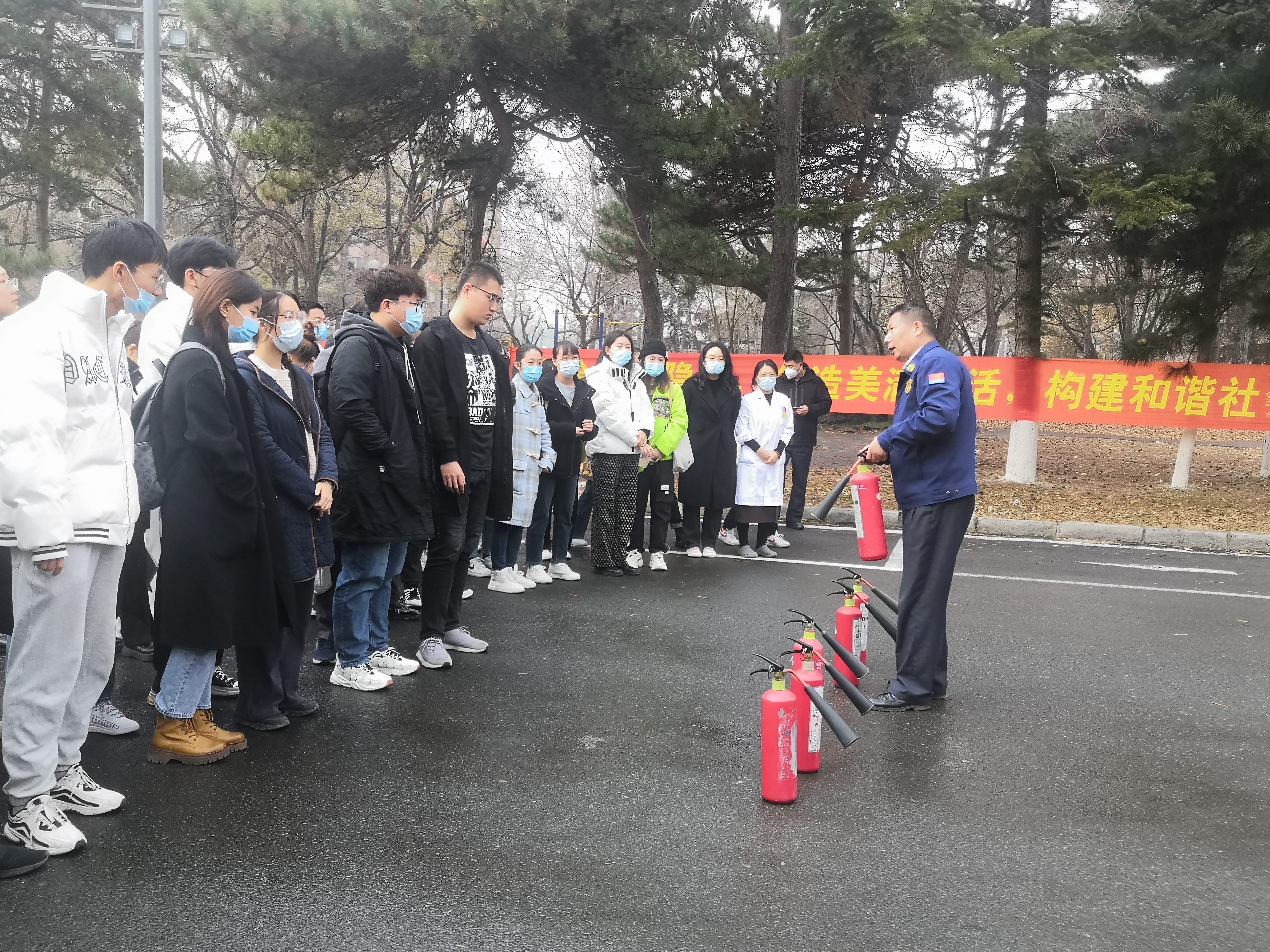 随后,组织2022级新生进行紧急疏散消防演练。演练中,安科长引导同学们沿正确路线进行快速疏散。到达安全区域后,安科长向大家详细介绍了灭火器和灭火毯的使用方法和注意事项,同学们积极上手操作,在安科长的指导下,提起灭火器,拿起灭火毯,实战“灭火”。