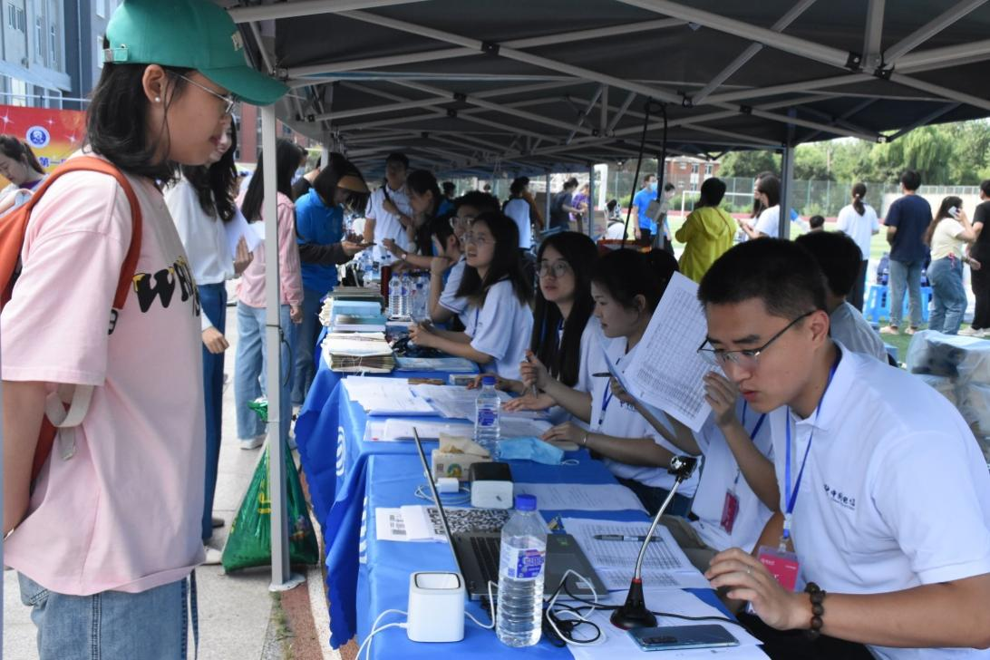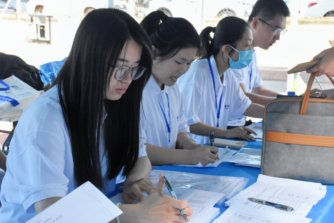 为保证迎新工作的优质高效,公司精准部署,按照公司要求对规定的核验内容和核验要点,认真落实,老师和员工志愿者在新民校区体育场引导新生办理入学手续、分发新生材料。