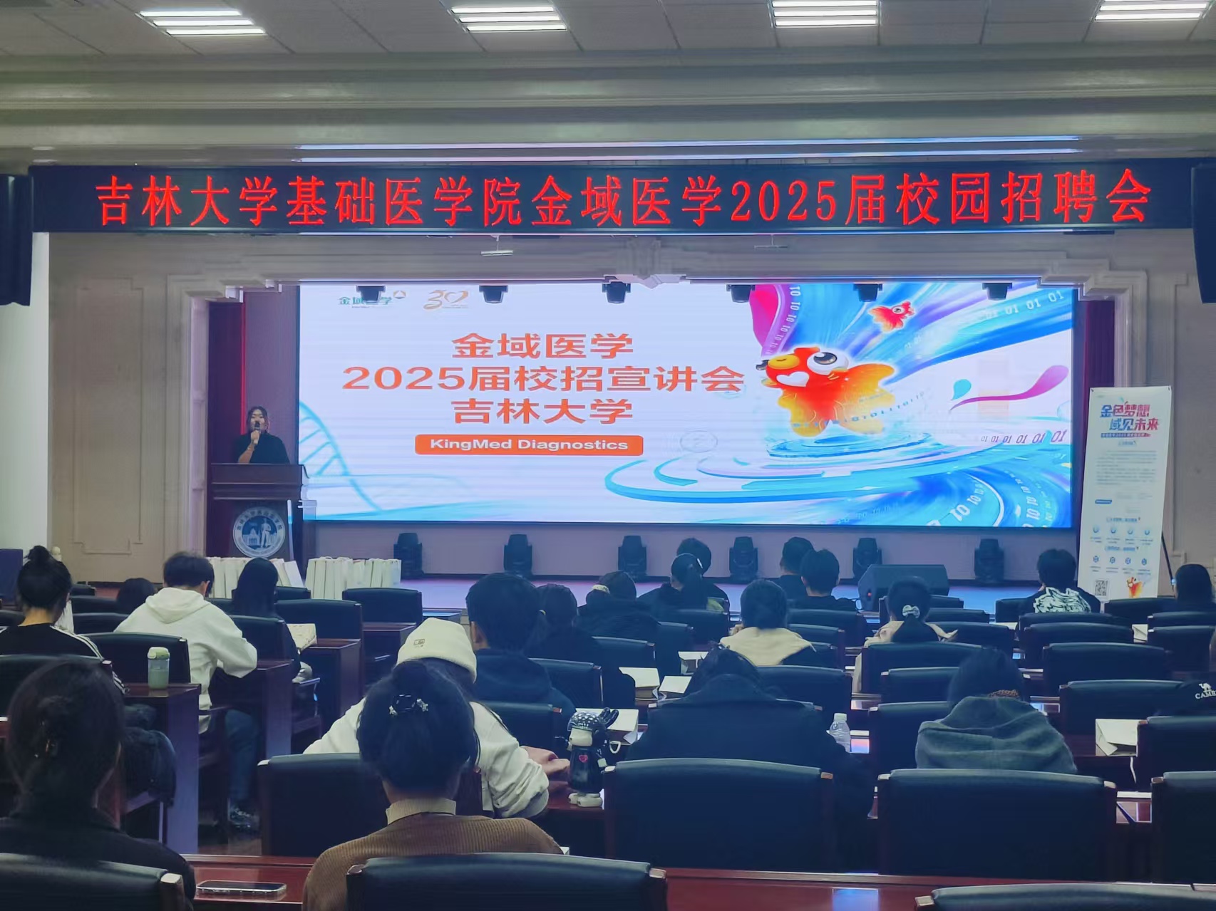 宣讲会伊始,吉林金域医学检验所总经理王双阁先生为在场的同学们带来了主题分享,深入浅出地介绍了医检行业的发展前景以及金域医学的企业文化和未来规划。经理的分享让同学们对该行业有了更深入的了解,也对金域医学有了更加清晰的认识。