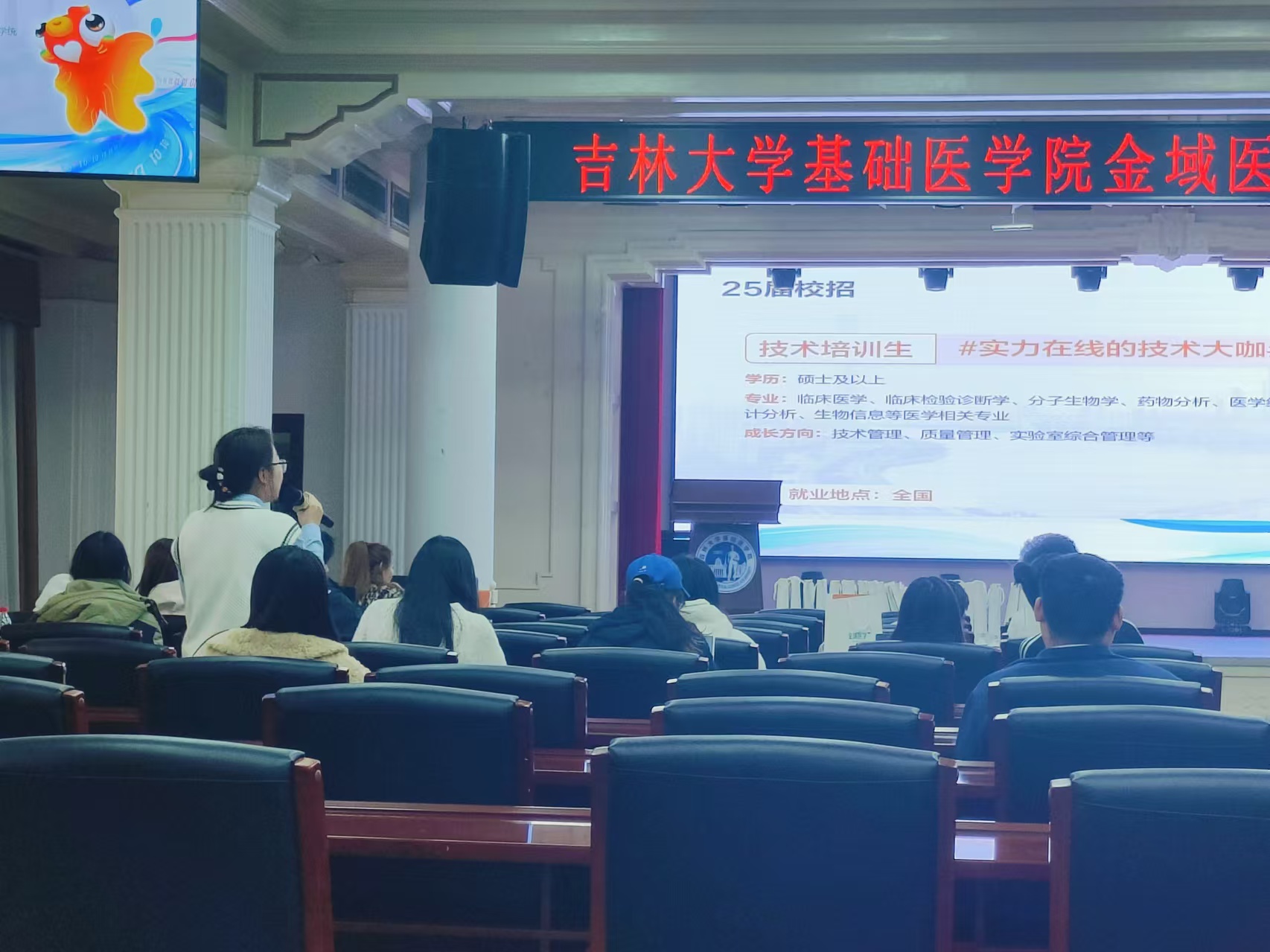 随后,威廉体育williamhill员工、吉林金域市场部血液肿瘤条线产品经理、科研负责人郇有为学长给同学们分享了他在金域医学集团的成长故事。他从自身角度出发为同学们讲述了选择金域公司的原因以及在金域的发展;郇先生的亲身经历和心路历程,让在场的同学们感受到了金域医学集团良好的工作氛围和发展平台。最后工作人员详细介绍了金域医学2025年校园招聘的岗位需求、应聘方式以及招聘流程,并提醒同学们注意查收面试信息。