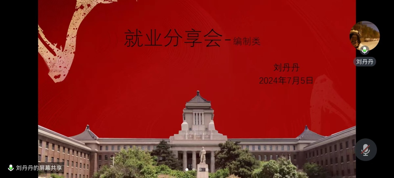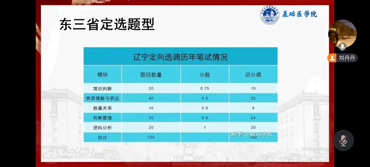 刘丹丹同学从招考资讯获取和笔面试准备两方面做了经验分享。她首先详细介绍了招考资讯的获取与筛选,介绍了常用的几种信息获取渠道,在此基础上介绍了她所了解的各种编制类的考试时间及考试内容、公务员事业编辅导员教师编考试内容重合与区别以及东三省定向选调条件和薪资待遇。此外,她详细介绍了自己的备考经历,分享了笔面试准备过程中的参考资料。最后,她提醒同学们一定要尽自己所能早做准备,在做好科研工作的同时,合理规划备考时间,以充足的准备把握好每一次机会。