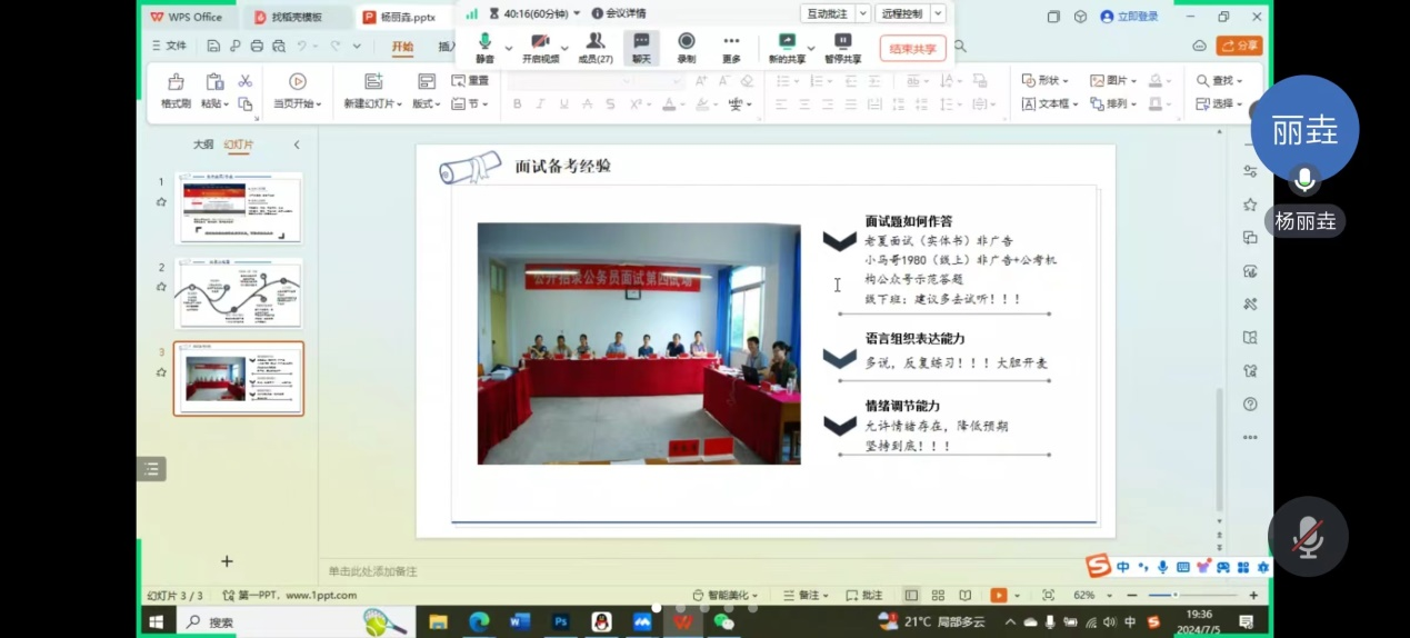 杨丽垚同学从备考经验与备考心态两方面做分享。她首先详细介绍了定向选调与普选的区别,提醒同学们根据自身情况做选择,及时关注公司官网及相关考公公众号的最新消息,并对考公的整体流程进行了简要的介绍,提醒同学们尽早准备,之后,她分享了面试备考经验,从多方面分享了面试题如何作答、语言组织表达能力如何提升。最后,她提醒同学们一定要提高自身的情绪调节能力,正确面对备考过程中的得与失,明确目标,坚定的向目标努力,方能有始有终。