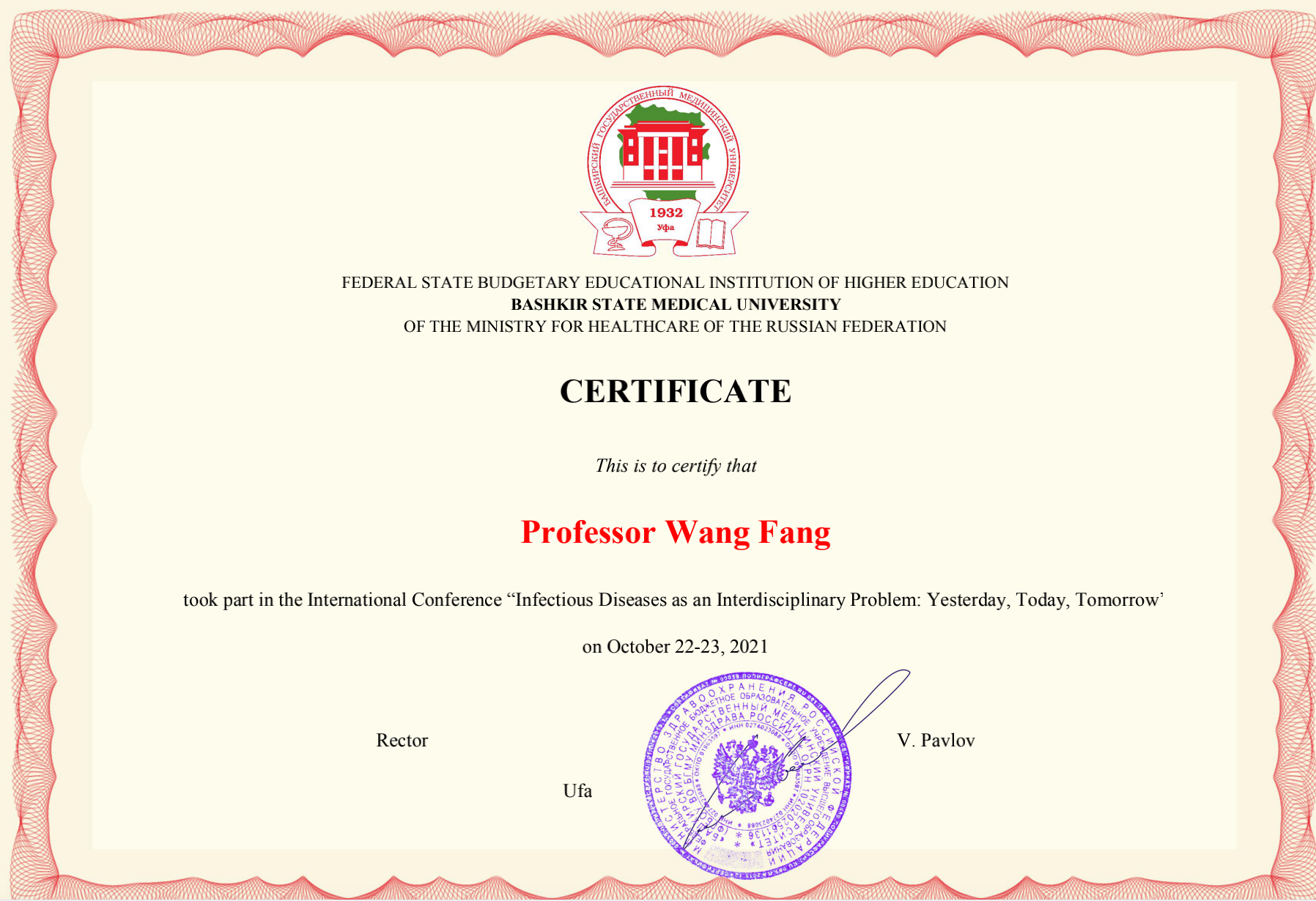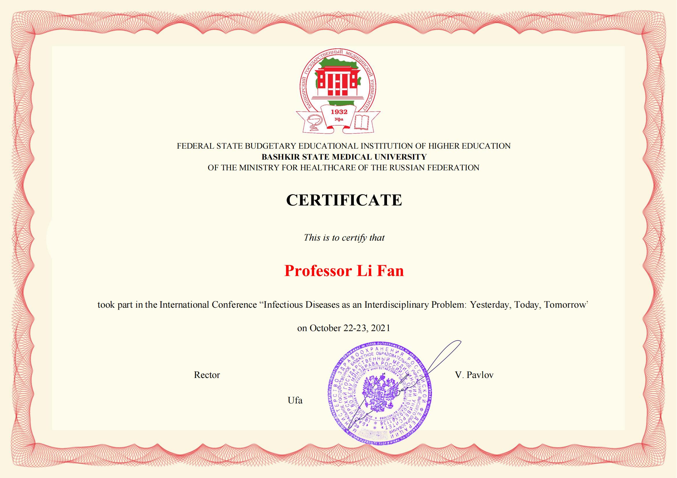 2021年 10月22日,威廉体育williamhill李凡教授、王放教授受邀参加由俄罗斯巴什基尔国立医科大学主办,主题为“传染病作为一个跨学科问题的昨天、今天与明天”的国际学术研讨会,来自俄罗斯、德国和中国的三百余位医学领域专家和科学家视频参会。李凡教授在开幕式上致辞,她表示希望通过本次会议,参会的各个高校、组织在卫生应急、防治传染病扩散、慢性病防控等领域,加深进一步的合作,强化重打传染性疾病的信息共享、检测、联防联控和应对机制,提升应对突发卫生事件的协调和合作能力,进一步地维护区域卫生安全。王放教授在线上作了题为“细胞因子风暴在新型冠状病毒肺炎中的作用”报告,结合医学微生物学和免疫学前沿知识,为新冠肺炎的发生发展做出了阐释。目前新冠疫情在全球仍在肆虐,基于世界各地的研究成果对新冠病毒的认识会更加深刻,对战胜疫情有极大的帮助。本次会议也对世界各地的新发和再发传染病做了系统性介绍。会议有俄罗斯巴什基尔国立医科大学董事长巴甫洛夫教授和哈尔滨医科大学杨宝峰院士等专家学者参会。