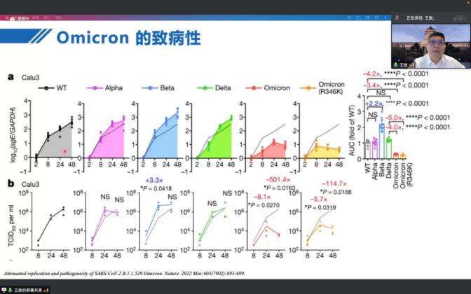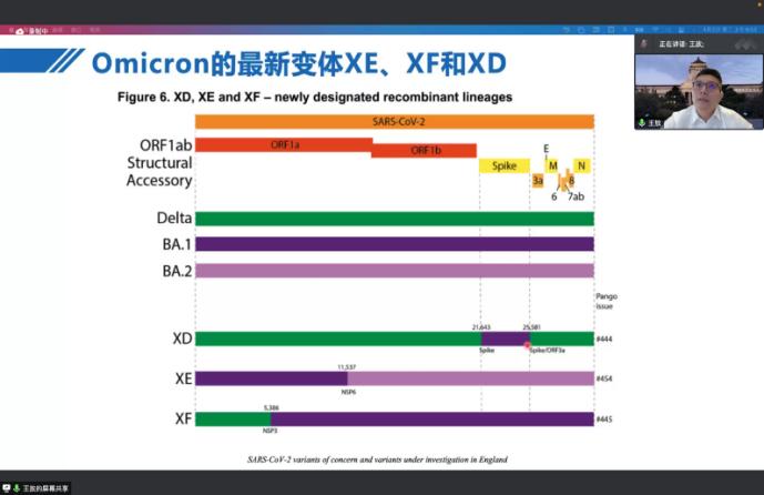 讲座由威廉体育williamhill副经理刘海岩教授主持,邀请威廉体育williamhill经理王放教授做了题为“Progress of virus detection technology and pathogenicity of SARS-Cov-2 Omicron”的专题讲座。王放教授首先以新冠病毒为例,详细阐述了目前全球范围内开展的病原体检测方法,并介绍了新型前沿的病原体检测技术。王放教授又分享了近期发表于CNS期刊上的新冠病毒最新科研动态,强调新型冠状病毒奥密克戎是新冠病毒的变异株,通过对比新冠病毒不同亚型的病原学特征及致病性,总结了疫情之下我们该如何进行有效的防护以及科学的治疗方式。与会师生们针对最前沿的新冠病毒检测技术、新冠病毒感染治愈后是否会形成机体免疫等方面展开积极互动交流。