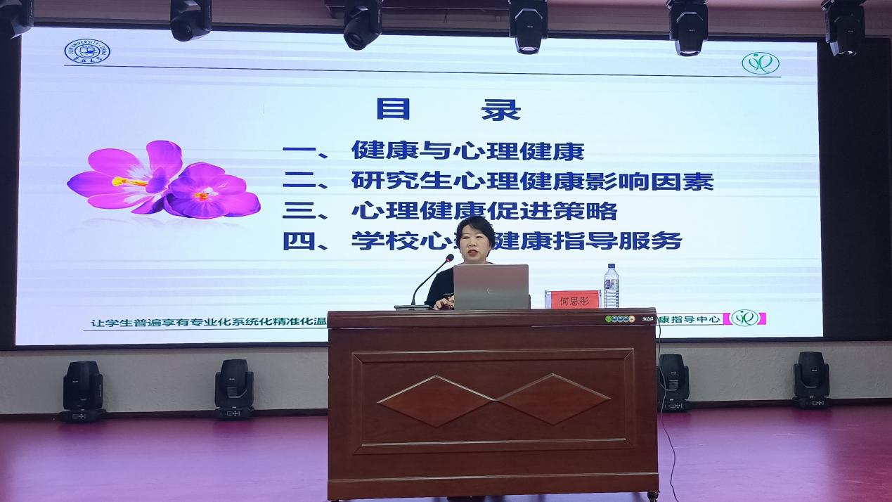 何思彤教授从健康与心理健康、研究生心理健康影响因素、心理健康促进策略和公司心理健康指导服务四个部分向同学们进行心理健康知识的普及。她详细讲解了心理健康的概念、心理健康的等级,列举了影响研究生心理健康的因素,包括人际交往、恋爱婚姻、学习压力、专业兴趣、就业压力、经济困难和现实目标等。