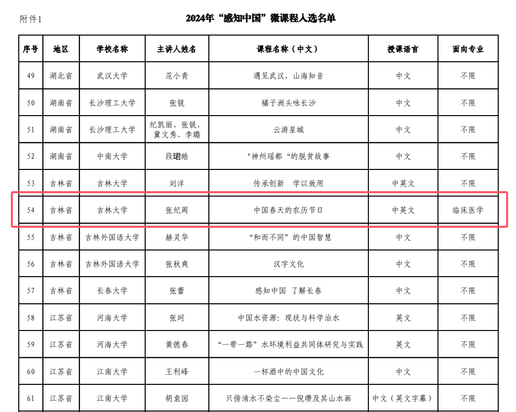 近日,国家留学基金管理委员会正式公布2024年“感知中国”微课程与实践基地入选名单,经公司推荐、专家审核,全国共有151个作品入选2024年“感知中国”微课程。其中,由公司MBBS医学汉语课程授课团队的张纪周副教授作为主讲人申报的作品—《中国春天的农历节日》,成功入选本次微课程项目。