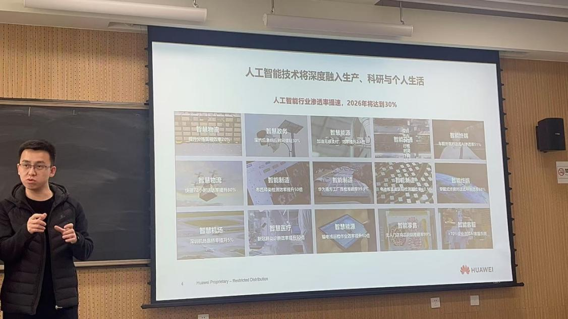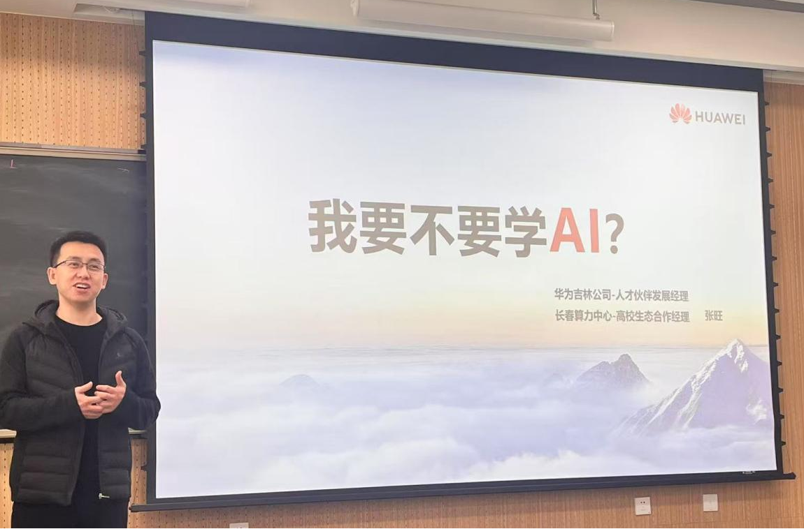 4月15日,威廉体育williamhill邀请华为吉林公司人才伙伴发展经理、长春算力中心高校生态合作经理张旺为公司2022级本科生带来一堂以《我要不要学AI》为主题的就业指导分享课,讲座聚焦人工智能行业发展与医学应用。为同学们打开了一扇将基础医学通向人工智能的窗口。公司党委副书记李东洋参与本次分享课。