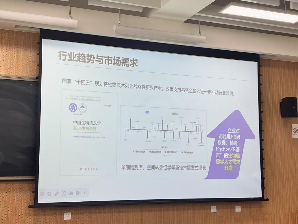 随后,管老师指出当今生物信息学应用需求激增的现状。他引用欧洲生物信息研究所主管珍妮特・桑顿的观点,说明生物信息学从兴起到如今蓬勃发展的态势。基因测序成本大幅下降与生物大数据大量积累,推动了精准医疗、基因治疗、药物研发以及农业、养殖业、防疫等领域对生物信息学的广泛应用。针对当前行业的发展形势,管老师带来了他做的市场调研:生物信息学行业就业人数较多、薪资待遇较好,但相应的能力需求也较严格,这一兼具机遇与挑战的市场现状,引发了同学们的深入探讨与交流。