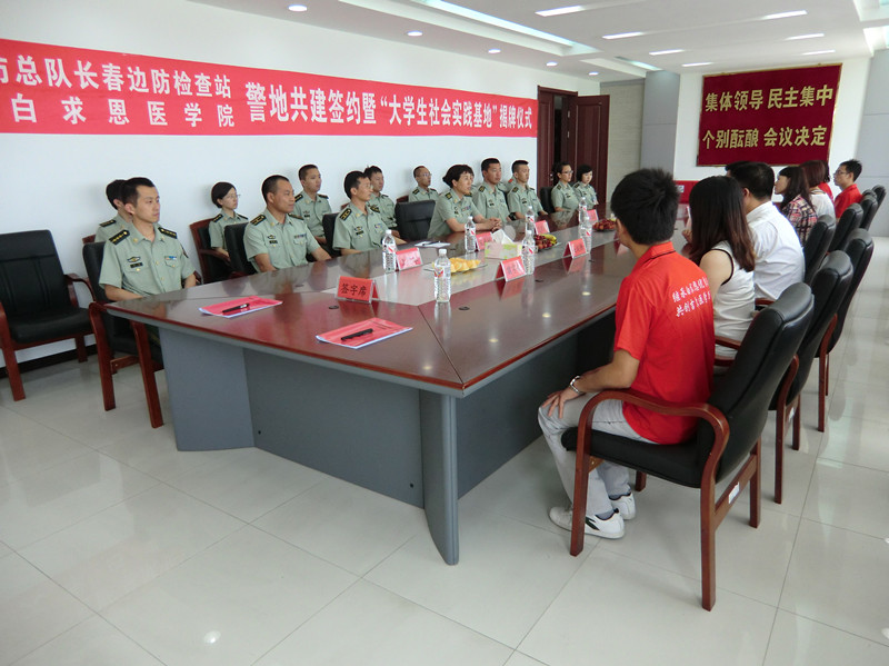 吉林省公安边防总队长春边防检查站长年担负长春龙嘉国际机场出入境边防检查和安全保卫任务,打击偷渡走私等违法犯罪活动,凭借其规范的执勤、温馨的话语和热情的服务,促进了口岸的和谐,赢得了中外旅客的好评,被群众誉为“北国春城的和谐使者”。白求恩医公司的此次活动,也为在校员工提供了一次与边防战士亲切交流,同时体验绿色军营生活的机会。(员工记者 张滨)