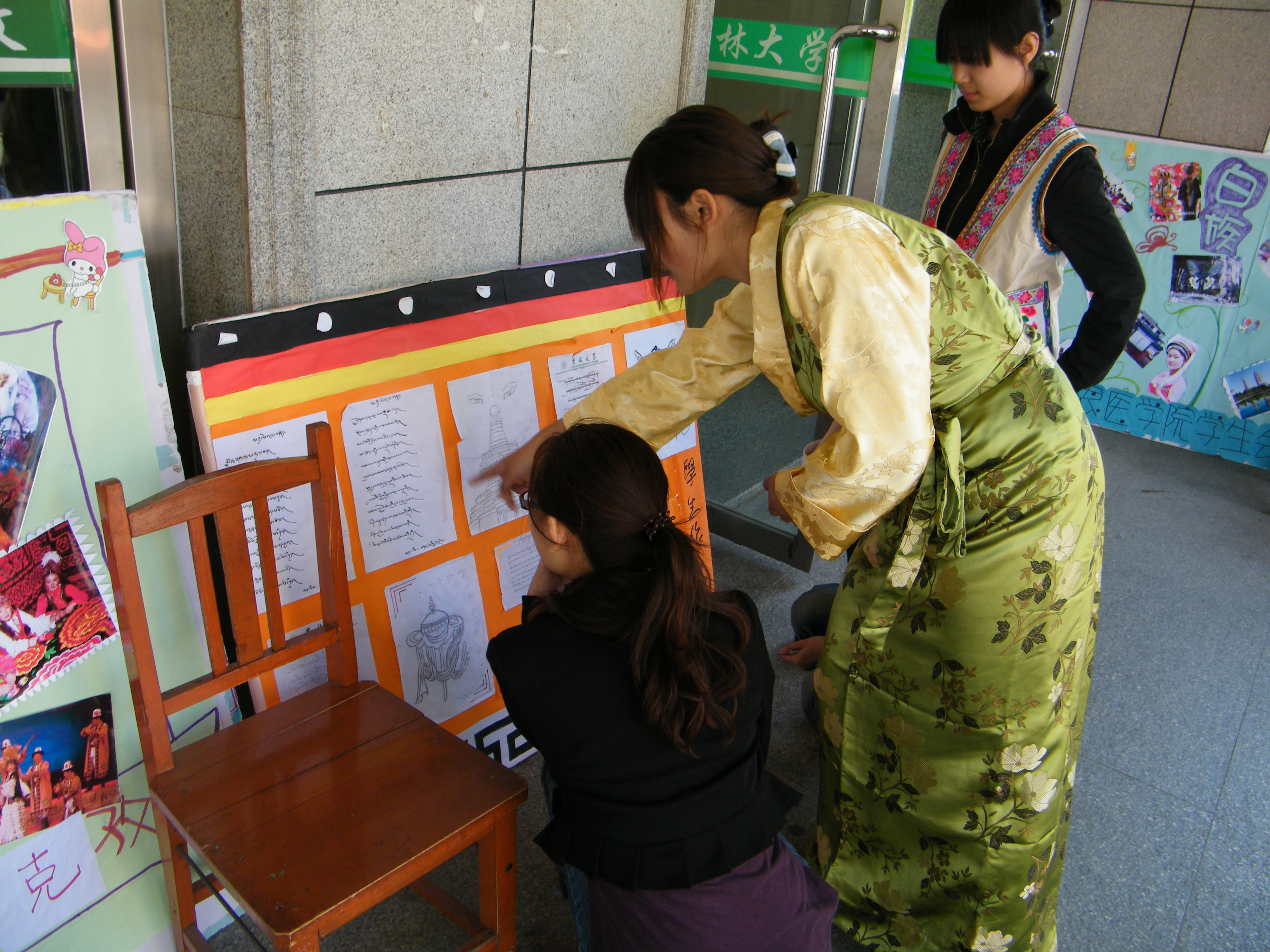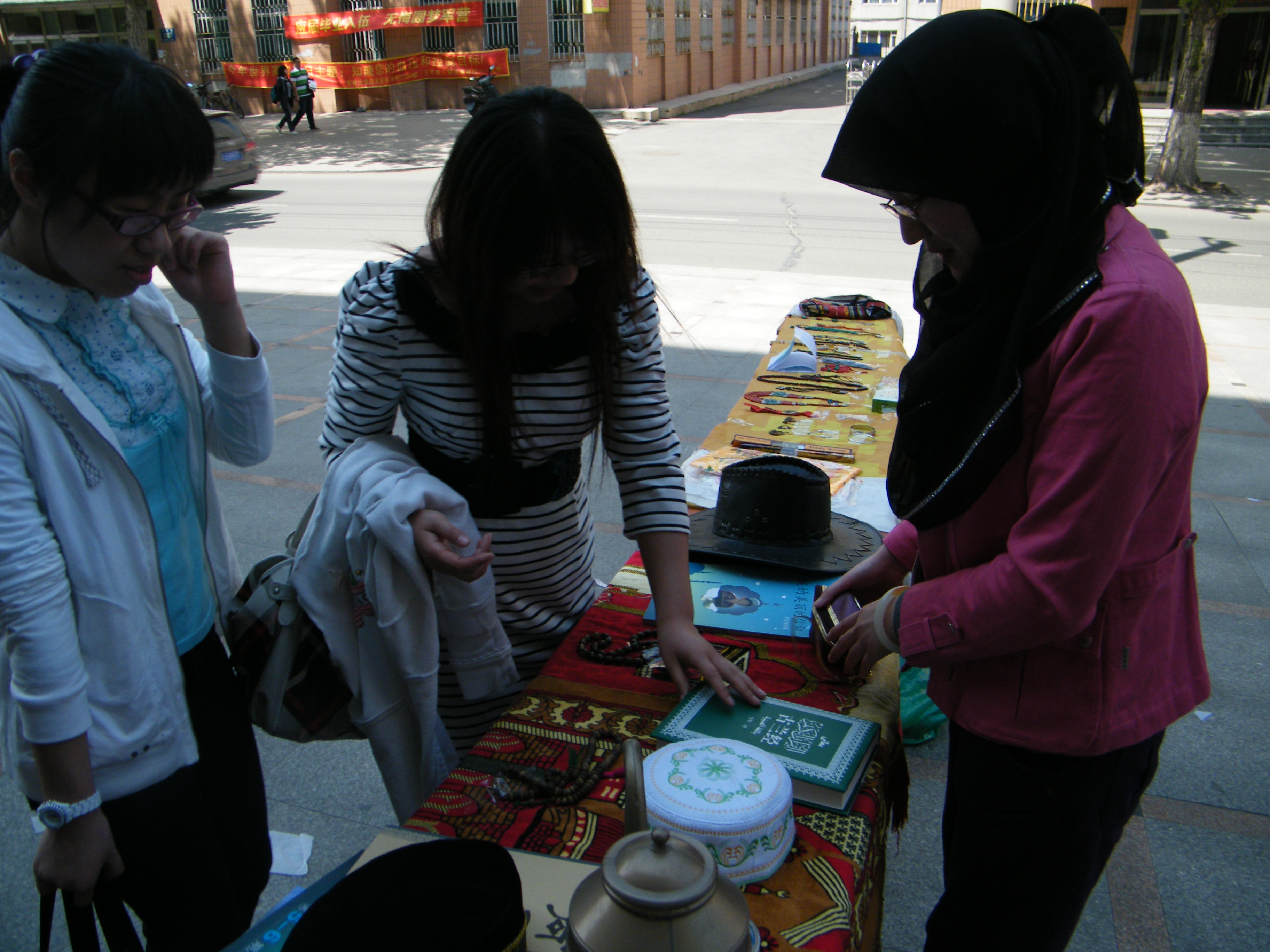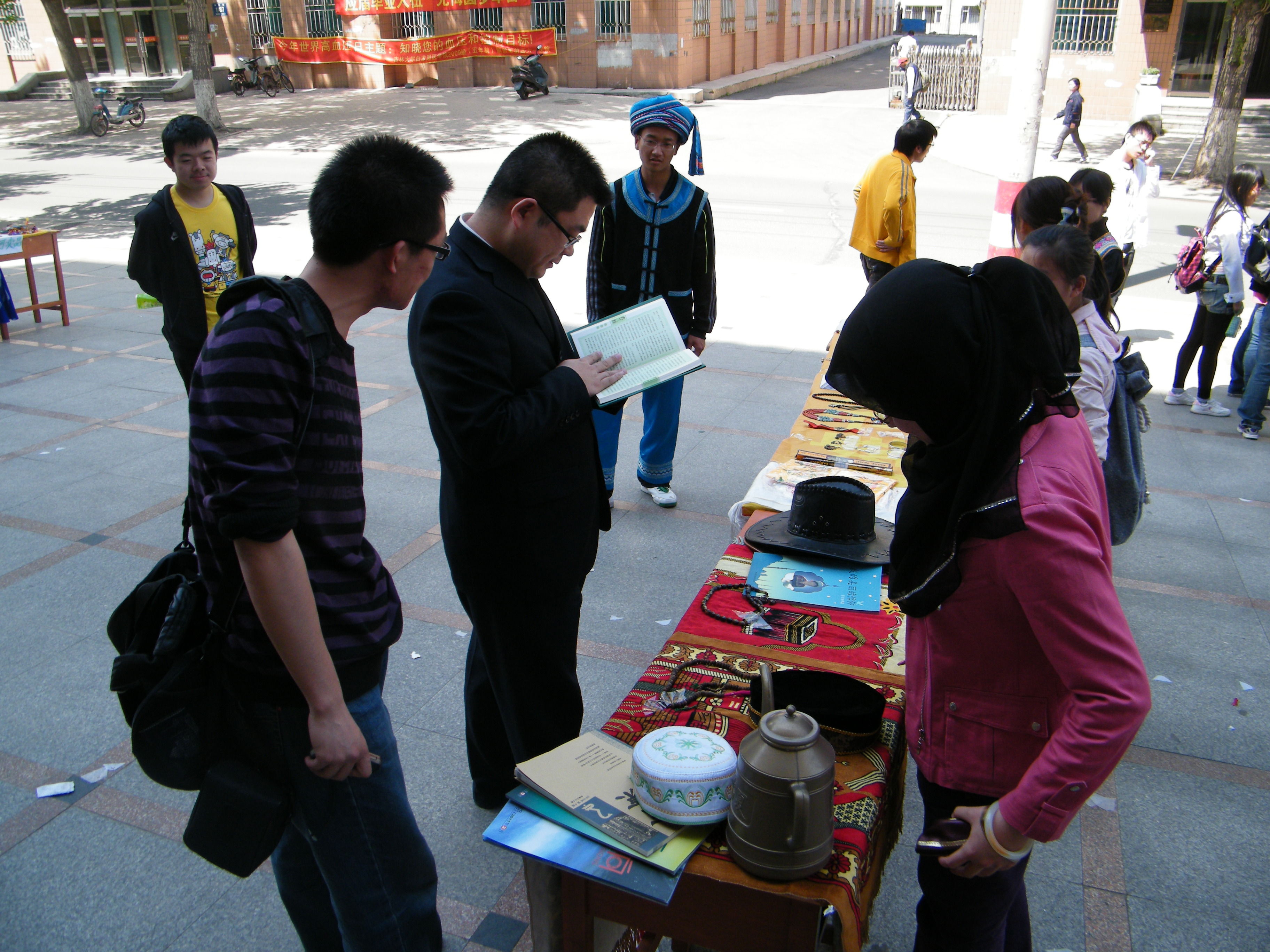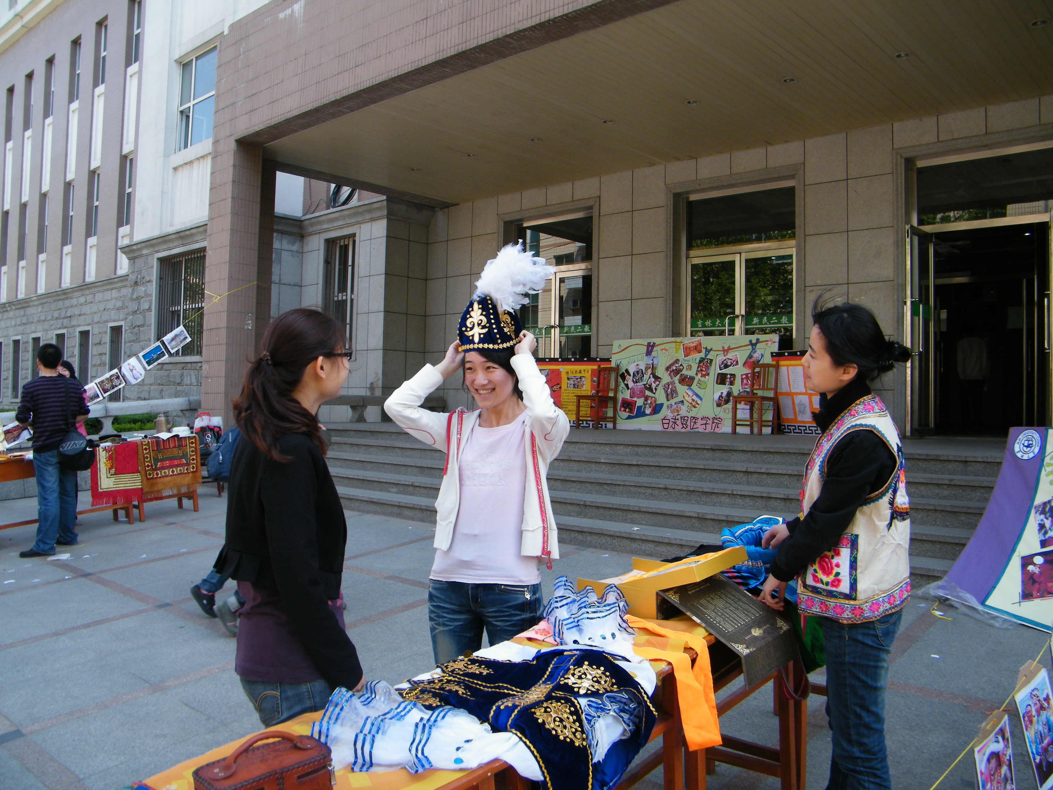 5月17日,白求恩医公司员工会少数民族工作部在新民校区第二教学楼外举办了一场少数民族风情展览。