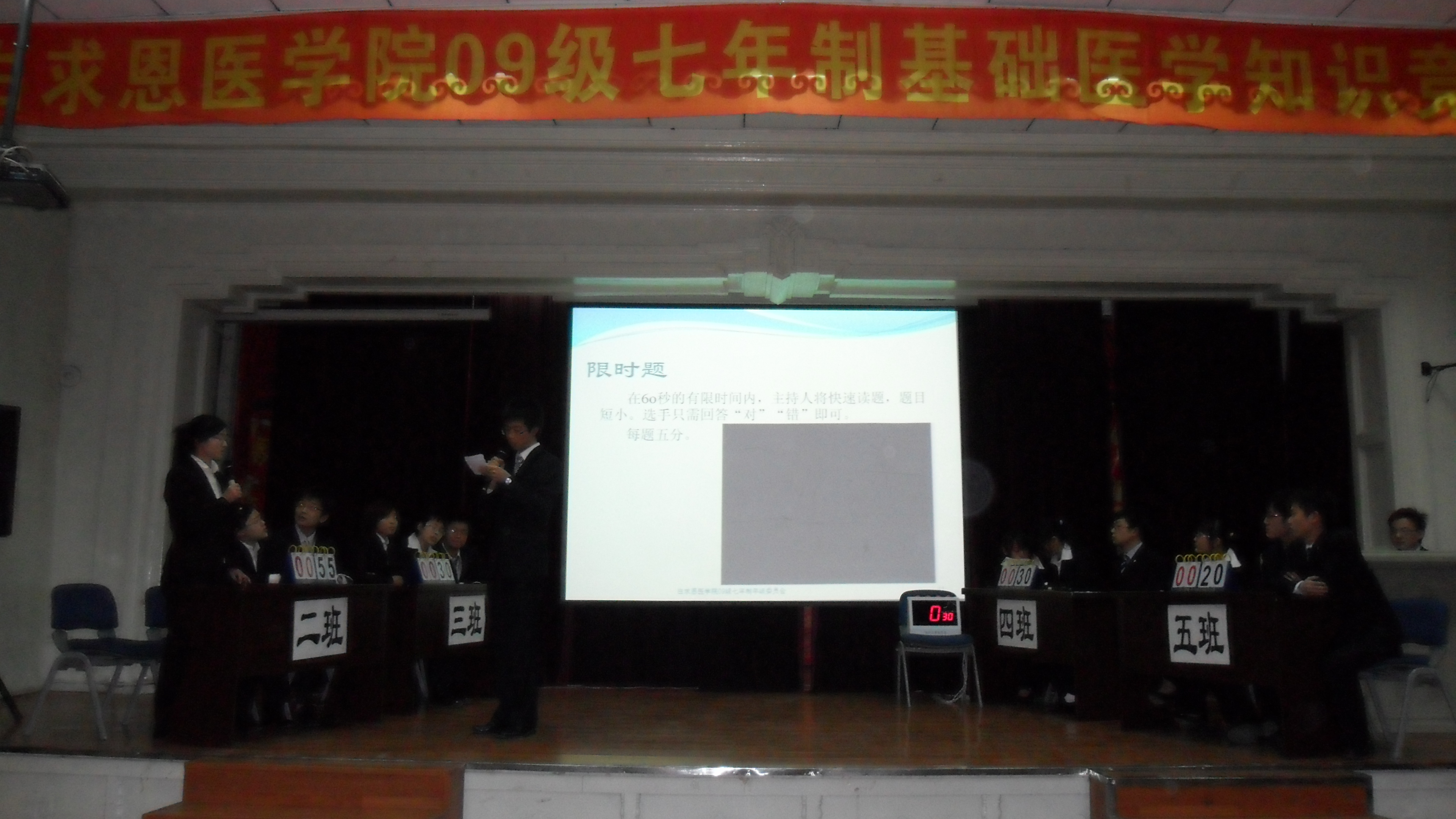 3月20日18时,白求恩医公司2009级七年制“基础医学知识竞赛”在基础楼二楼多功能学术报告厅举行。组织与胚胎学系主任周莉、生物化学与分子生物学系生物化学教研室副主任杨成君、细胞生物学系主任费瑞、生理学系张春晓老师、解剖学系夏长丽老师担任了此次竞赛的评委。白求恩医公司员工工作办公室主任吴剑锋出席了比赛。