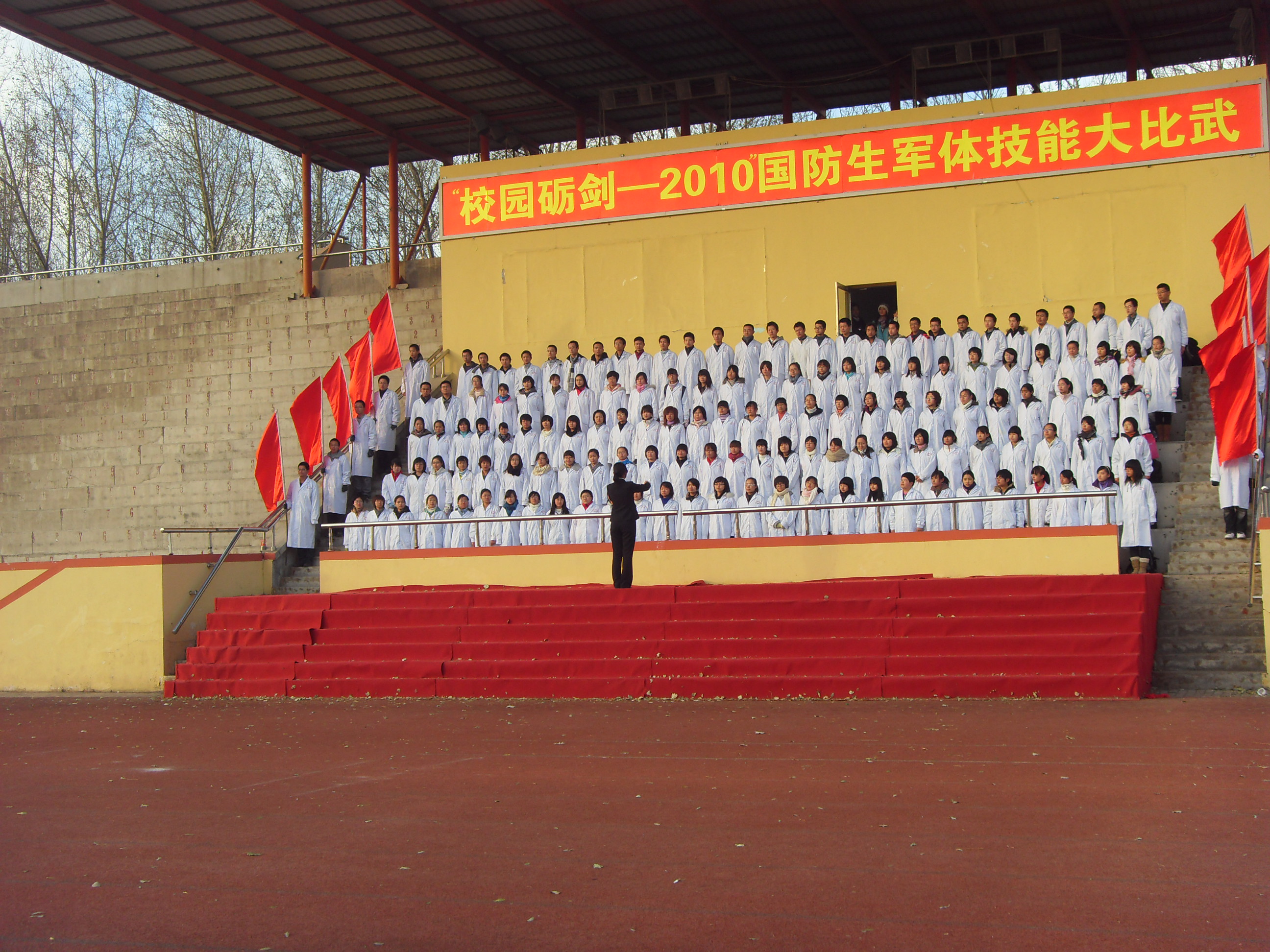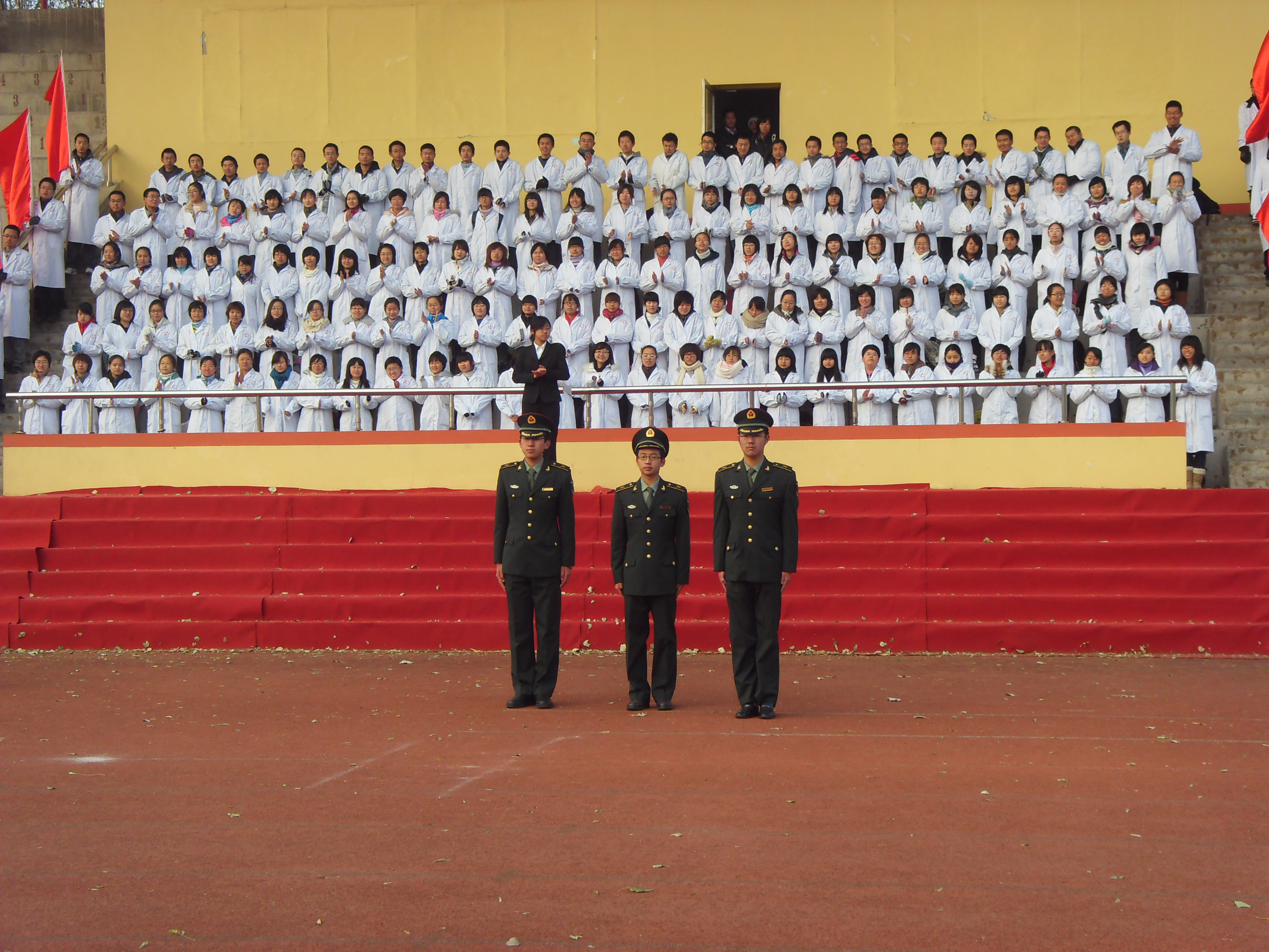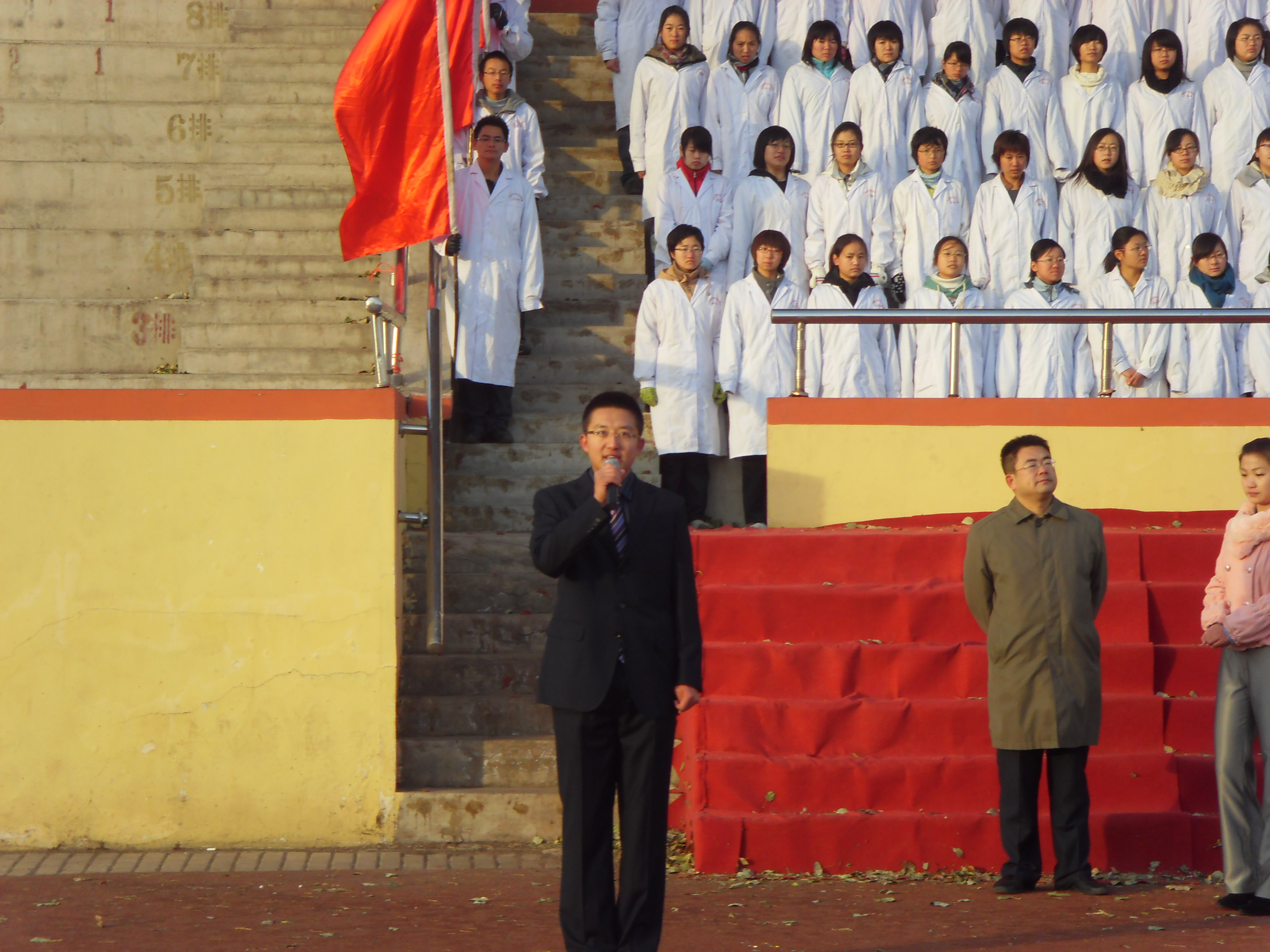 白求恩医公司2010级年级长李建男担任升旗手,基础园区员工会团委副书记兼公司2010级体育部部长邹运、2010级医学试验班团支书朱宇航担任护旗手,他们和同学们组成的国旗护卫队意气风发,迈着整齐的步伐、庄重而肃穆的护送着国旗走向升旗台。公司2010级长学制所有女同学则身着一袭白衣,以准医生的身份立誓为国家效力,并以一首响亮的《红旗飘飘》表达了对红旗的热爱、对祖国的赤诚。