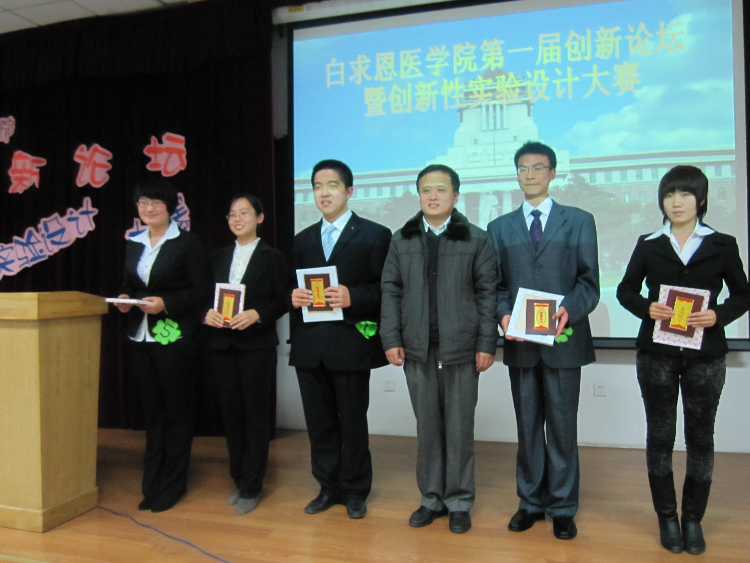 首先,白求恩医公司员工会主席刘兴任致开幕辞,他号召全体同学掌握扎实的基础,提升创新的思维,插上创新的翅膀自由飞翔。随后,经过初赛选拔出的五位选手分别就“特异性的激活和抑制水通道蛋白及氯离子对喉癌细胞的凋亡影响”、“抗体进入细胞核内会怎样”、“钙离子在皮肤修复中不可缺少,探究最佳促使皮肤修复的钙离子浓度,减少修复型保湿剂对皮肤的损伤”、“木香提取物治疗急慢性胃溃疡”、“通过提取丝氨酸蛋白酶中的有效结构域,对味觉中影响咸味的传导机制进行调控,从而达到减少食盐摄入量、控制高血压的目的”五项内容进行了阐述。选手们分别从背景资料、实验设计、结果预期和未来展望几个方面进行论述后,评委们进行了提问。选手们或慷慨自信的进行实验设计陈述,或虚心谦逊的接受评委老师的指导。现场的观众也积极参与,提出自己的疑问,与参赛选手进行交流。最终,由徐永明、董航、刘轶组成的团队获得一等奖。