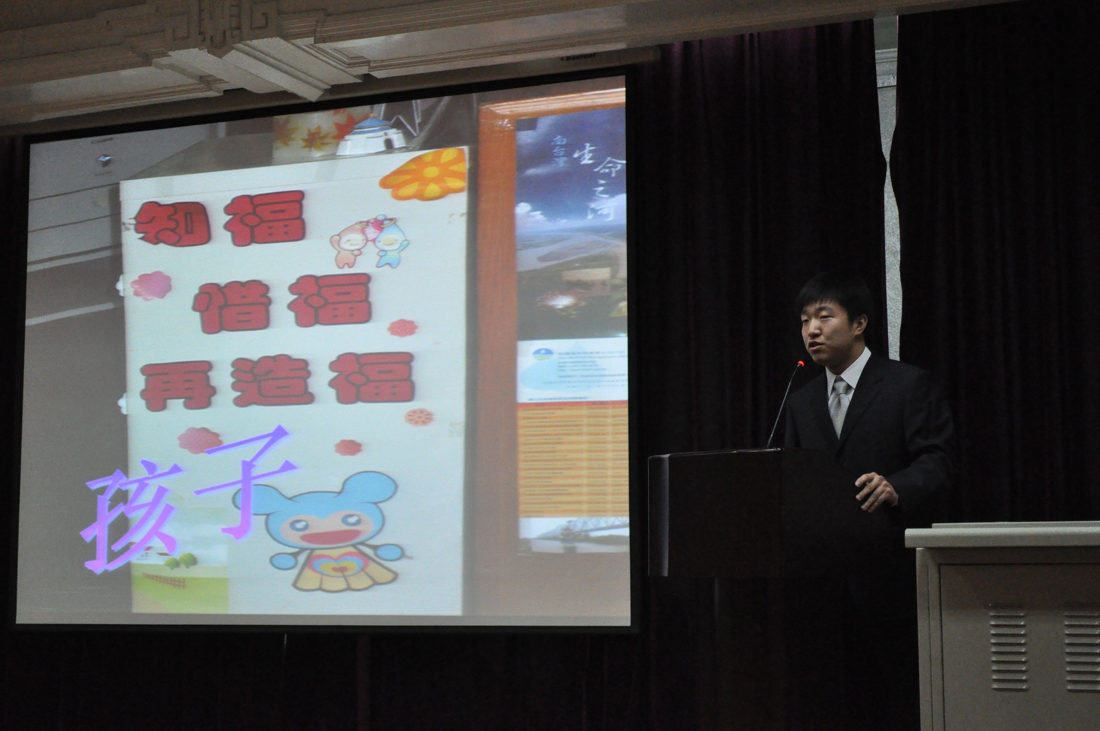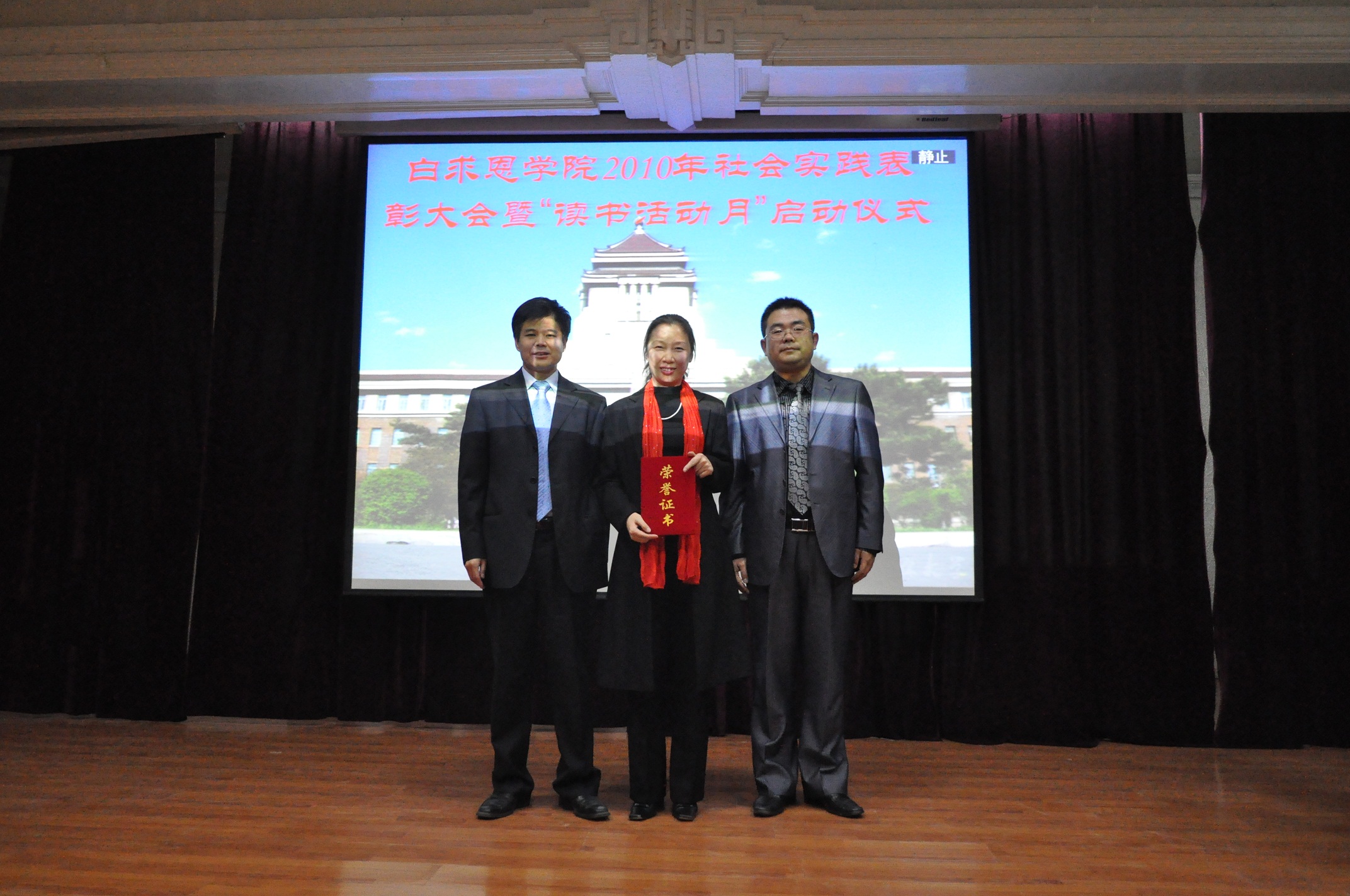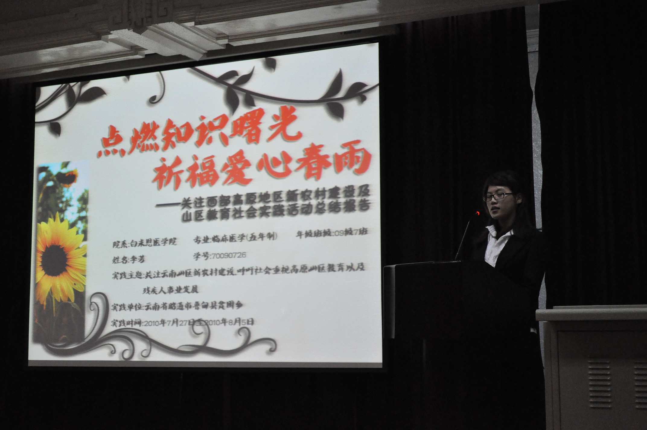 首先,团委副书记李玲玉对2010年暑期社会实践活动进行了总结,团委副书记李梓萌对扶残助残和残疾人调研专项活动做了汇报。白求恩医公司本年度的社会实践工作部署早,参与面广,效果明显,涌现出了一批优秀团队和先进个人,撰写了一批高质量的社会实践报告。在表彰大会上,11位获奖代表先后就自己的暑期社会实践做了精彩的发言。才仁卓嘎回到玉树家乡用志愿服务传递永恒的白求恩精神;张滨、林萍等人组成的寻根之旅为牛眼沟村白求恩希望小学的孩子们插上了理想的翅膀;李芳独闯西部高原引发了深深的思索;孟凡会、关伟的残疾人调研小分队搜集了大量详实的资料;周玄博的启智培训公司之行告诉我们知福、惜福、再造福;曲垠梦、牟胜男分别为敬老院带去欢乐与关怀。获得特别贡献奖的牛眼沟村支教团指导教师张纪周也讲述了自己的感受与体会。