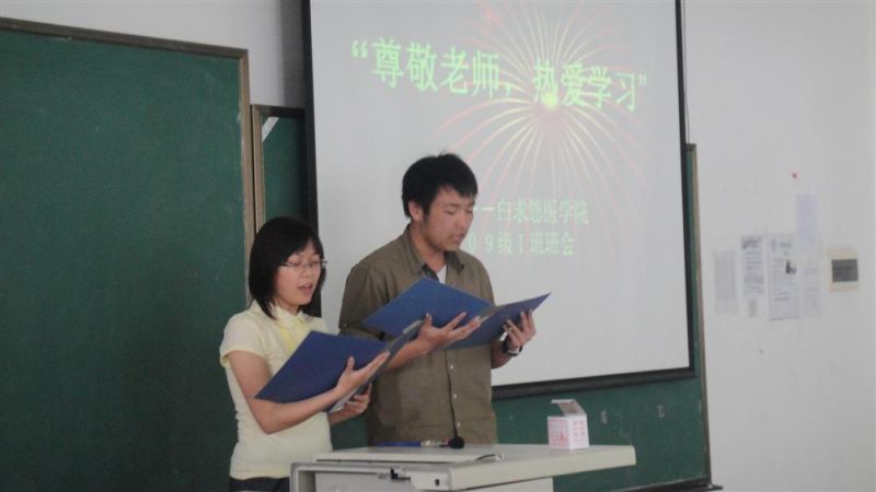 4月15日下午,白求恩医公司09级白求恩医学班在新民校区2404教室召开“尊师重道,热爱学习”主题班会。班级联系教师、白求恩医公司党委书记屈英和教授参加了班会。
