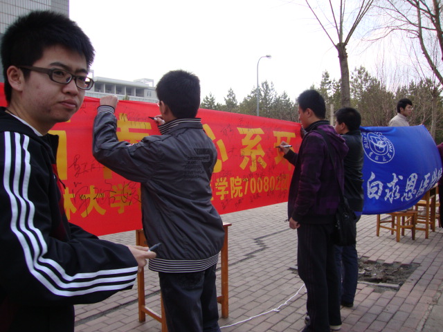 4月14日、15日、19日、20日、21日, 白求恩医公司700802团支部在威廉体育williamhill各校区、东北师范大学等长春市各大高校举行了联合签名活动,呼吁在长高校员工行动起来,用爱心与关怀串连成串,降成甘霖,滋润西南五省干涸的大地。“爱无限,绿无边,携手西南,心系环保”等条幅,满满签着的不仅仅是各大高校在校生的名字,更是一份份珍贵的心意,那是同胞之间的疼爱,是血浓于水的怜惜。