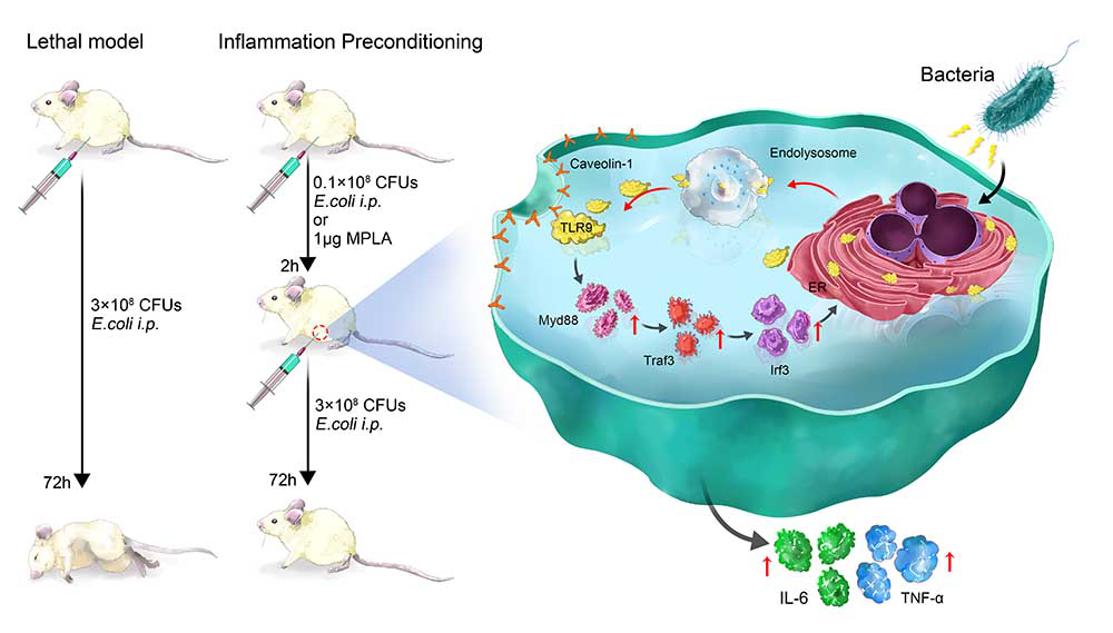 在此项研究中,研究人员分离大肠杆菌有效成分,发现经过减毒化学修饰的脂多糖——MPLA能在小鼠脓毒血症模型中诱导InP保护作用,且通过流式细胞分选过继转移实验及基因敲除小鼠相关实验揭示,mTLR9+PMN是InP保护作用的关键靶细胞。应用荧光共振能量转移实验表明,MPLA触发TLR9发生细胞膜转位后与细胞膜小窝蛋白-1(Caveolin-1,CAV-1)偶联,并确定CAV-1与TLR9结合位点。同时,TLR9促进MyD88介导的TRAF3和IRF3信号转导通路,释放细胞因子IL-6和TNF-a。此外,对临床不同分期的脓毒血症患者血液样本检查表明,患者预后效果与其外周血PMN表面TLR9和CAV-1的表达密切相关。