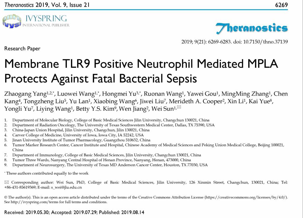 Yang Z, Wang L, Yu H, Wang R, Gou Y, Zhang M, Kang C, Liu T, Lan Y, Wang X, Liu J, Cooper MA, Li X, Yue K, Yu Y, Wang L, Kim BYS, Jiang W, Sun W. Membrane TLR9 Positive Neutrophil Mediated MPLA Protects Against Fatal Bacterial Sepsis. Theranostics. 2019; 9(21): 6269-6283.