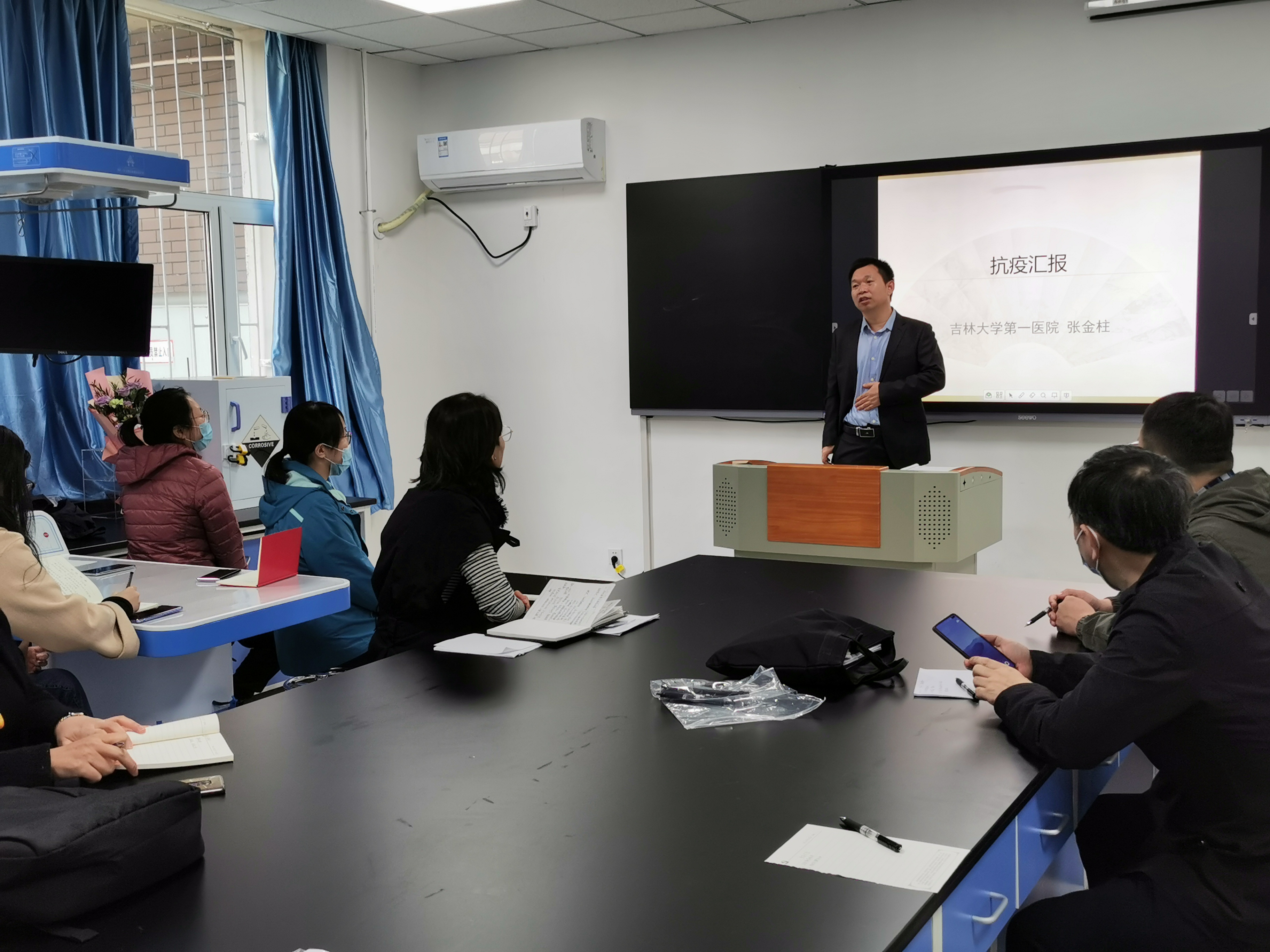 本次活动邀请到参加通化抗疫的一线医生,公司第一医院神经血管外科重症监护室张金柱老师讲座。张金柱老师在重症监护室工作10余年,对重症患者的救治非常有工作经验和独特见解,在2021年初主动请缨同吉大一院抗疫医疗队到通化抗疫第一线参加重症患者的救治工作。张老师从“政府不容易、人民不易和医务工作者不易”三个方面进行讲述,从学术专业角度讲述了新冠病毒的流行病学特点、临床表现、治疗及预防等,也说出了参加抗疫前后以及凯旋归来的所思、所想和所感,朴实的话语却感人至深,真正体现了一名普通的医务工作者“不畏艰苦、甘于奉献、救死扶伤、大爱无疆”精神面貌。随后,药理学系的靳英丽和关凤英两位老师与张老师进行了深入交流。