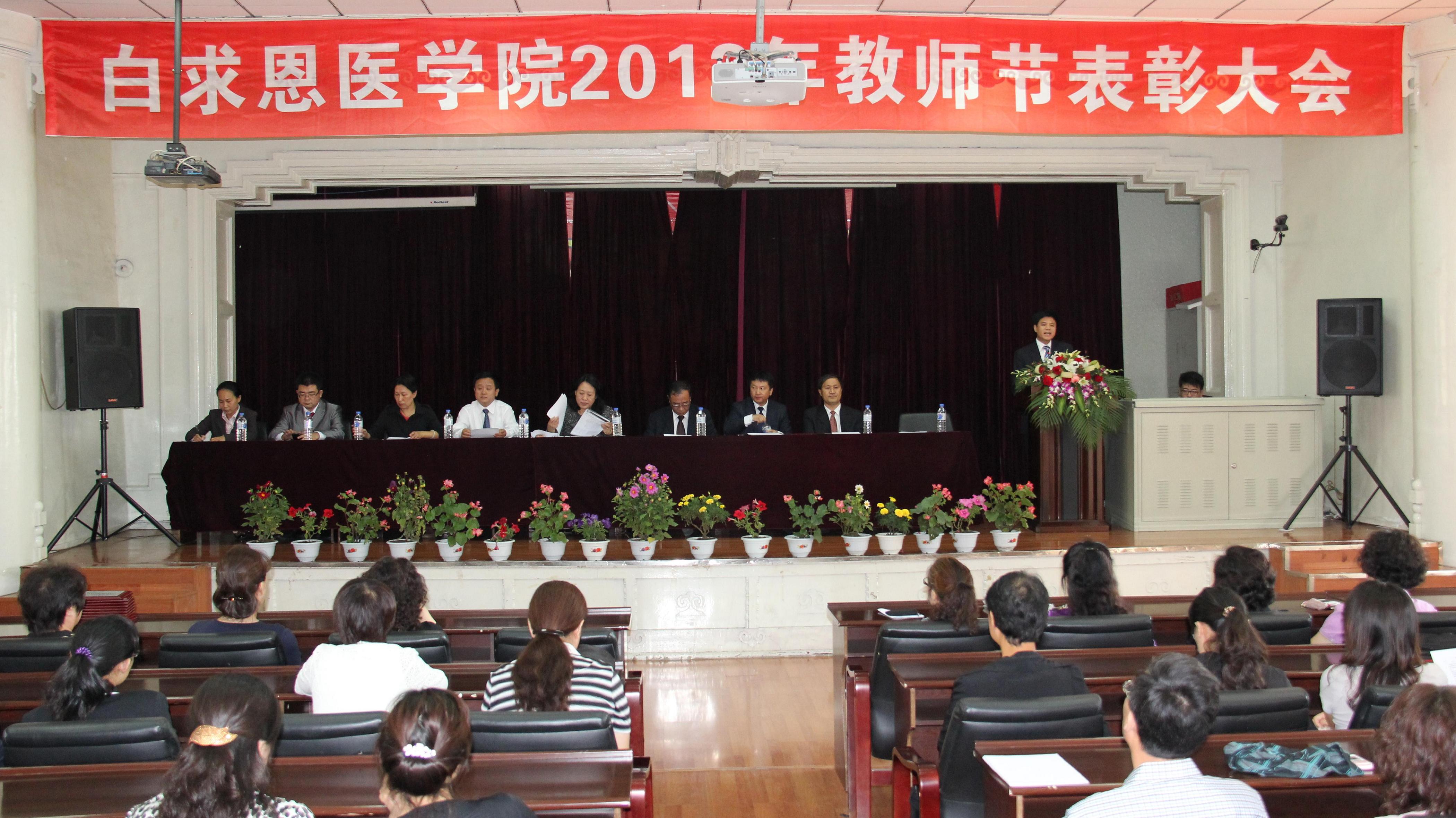 金秋九月,丹桂飘香,在第28个教师节当天,9月10日上午,白求恩医公司在基础楼二楼多功能学术报告厅隆重召开2012年教师节表彰大会。对在教学、科研等工作中做出突出贡献的教师进行表彰。白求恩医公司全体院领导及教职员工参加了大会。会议由公司党委书记屈英和主持。