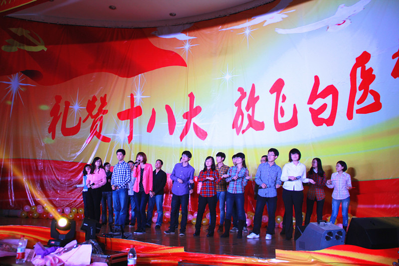 记录了大一新生生活的微电影带着全体观众重温新生入学后的点滴回忆,身着炫丽服装的演员们以火辣的开场舞《我们的style》点燃全场,拉开整场晚会的序幕。随后,2012级新生代表分别向名师班主任献花。,表达员工对老师的无限敬意。接下来,伴着激昂的音乐,男女对唱《我爱你,中国》唱出了对祖国的美好祝福。新疆舞蹈《欢庆》使观众们领略少数民族风情,博得全场喝彩。乐器合奏《昔乐今律》实现了古典乐曲与现代音乐完美融合。而精心设计的荧光舞《解剖室之夜》更是结合了医员工的专业特点,令人耳目一新,将全场带入高潮。歌曲串烧《年代秀》让观众重温了各个年代的经典旋律,小品《甄嬛新传》更是凭幽默的表演引得全场掌声连连、笑声不断。舞蹈《咏春》诠释了清新纯净的中国风。诗歌朗诵《瑞雪迎春》礼赞十八大、歌颂共产党,并展示了公司开展的“献礼十八大,躬身实践中”社会实践与志愿服务活动取得的优秀成果,将正常晚会推向高潮。最后,第二届全国老员工基础医学创新论坛暨实验设计大赛的11名获奖选手及2012级各班辅导员助理合唱《爱因为在心中》,温暖了整场,为本次晚会画上了一个完美的句号。