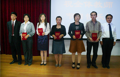 在第25个教师节来临之际,白求恩医公司于9月10日下午在新民校区第二教学楼2402教室举行2009年教师节表彰大会。白求恩医公司党委书记屈英和、常务副经理孙连坤、白求恩医学部副学部长侯治富、教务处副处长金祥雷、吴运涛、第一临床公司副经理牛俊奇、白求恩医公司领导、部分外籍专家、教师代表和员工代表参加了大会。大会由白求恩医公司副经理程丕显主持。