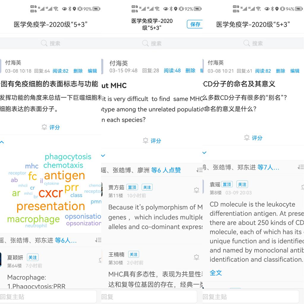 为了做好2020级医学“5+3”一体化本科生《医学免疫学》课程的线上教学,负责本教学轨道的付海英老师和杨巍老师通过开课前、线上教学前及开课三周后的学习通问卷调查及员工的个别沟通,在充分了解员工学习习惯以及学习需求的基础上,以学业挑战度、学习效果双保证为理念,与2020级医学“5+3”一体化的员工们一起就学习内容、教学方式、平台使用等多方面互相讨论、互相学习,教学相长,在良好的学习氛围中共同建立了超星学习通平台结合腾讯会议的《医学免疫学》线上双语教学新模式: