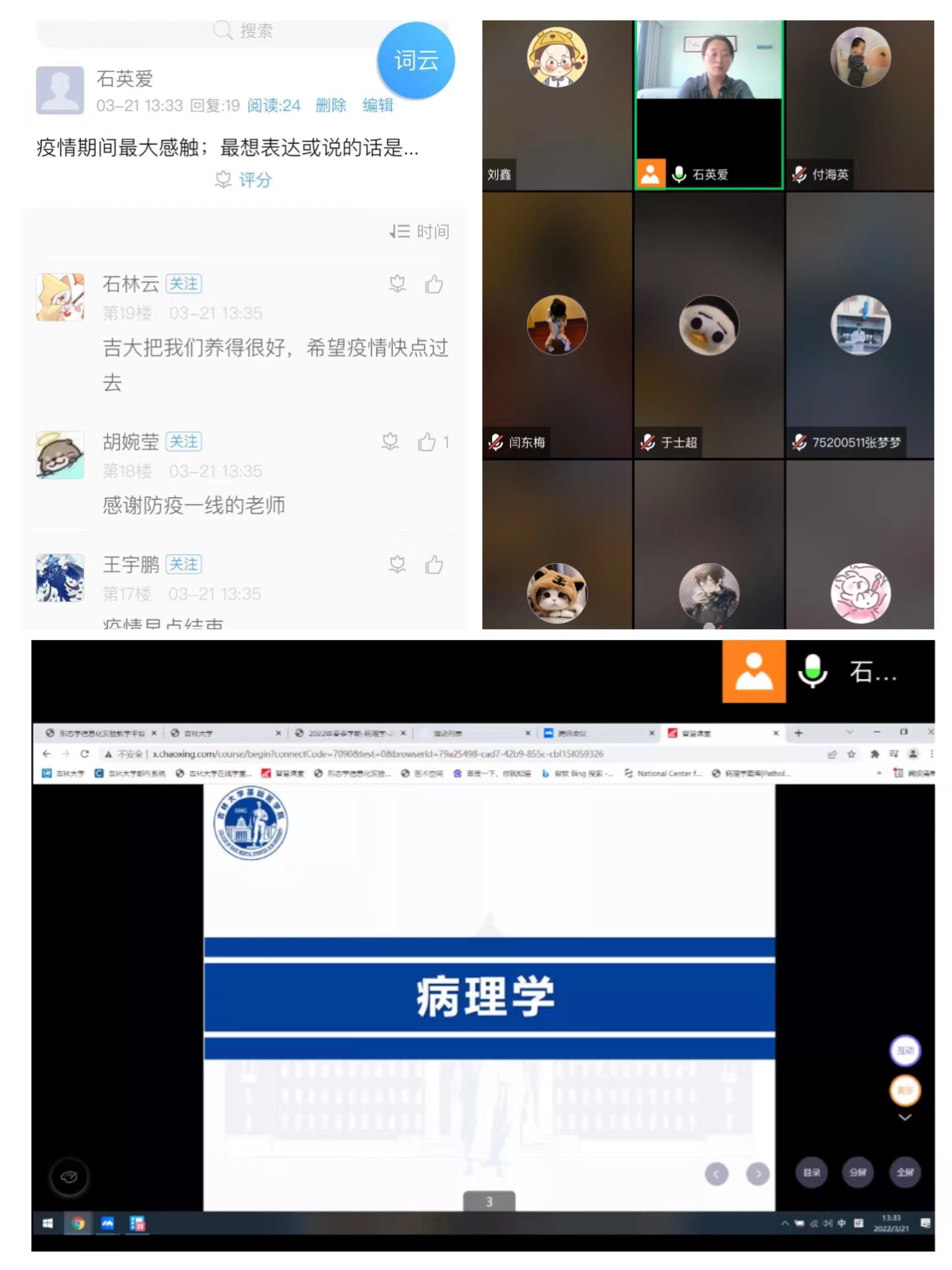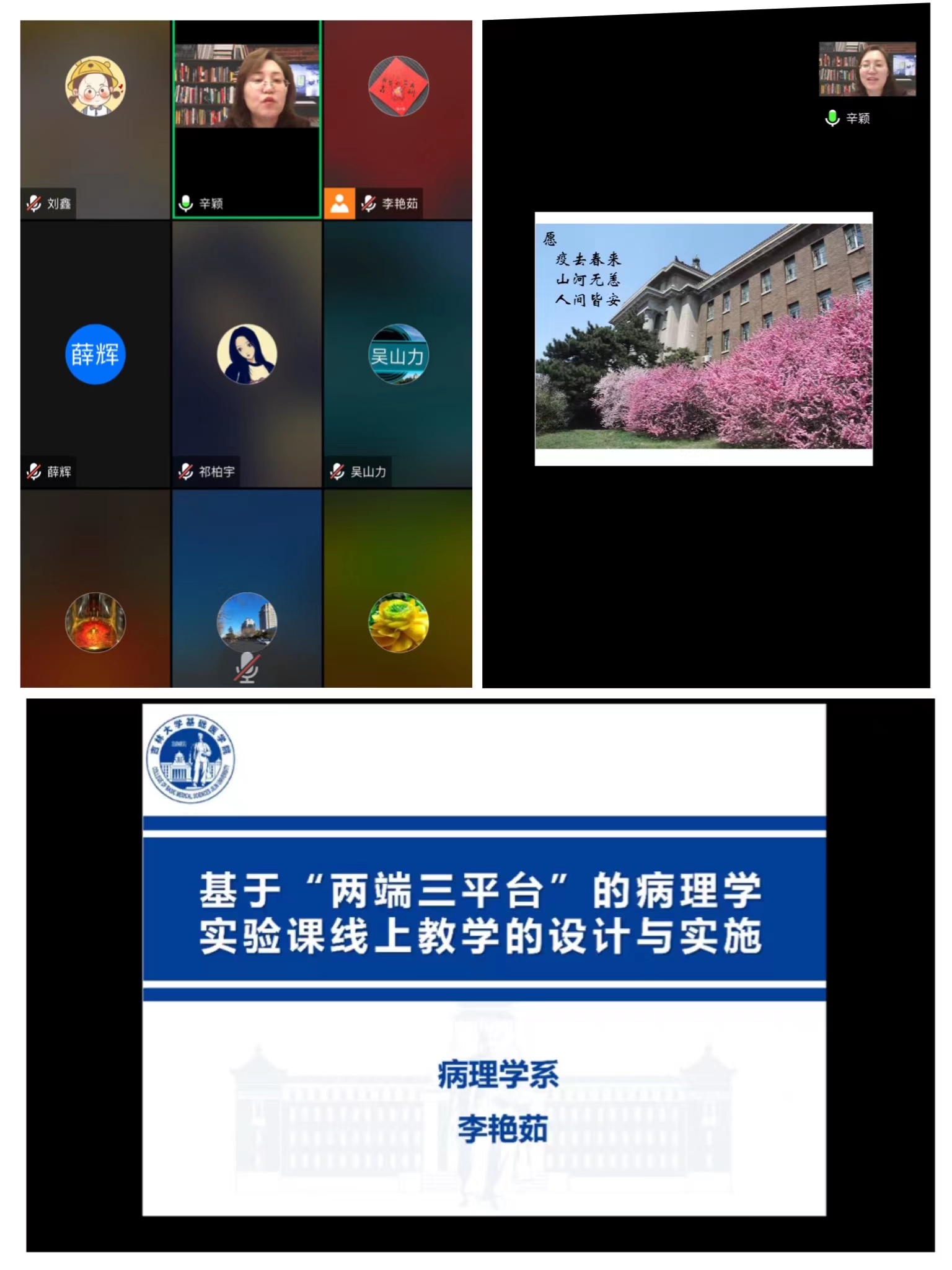 病理学实习课线上教学观摩选择的是石英爱老师讲授的“细胞和组织的适应与损伤”,上课伊始,石老师为各位同学和老师展示了一段吉大优秀学子制作的抗疫合唱视频,鼓励员工要坚信春天一定会很快到来;接着石老师通过病理学系建设完成的形态学数字化教学平台和虚拟实验资源指导员工在云端观察3D大体标本和数字切片,同时通过设计抢答、问答、员工展示等多项互动,调动员工的学习积极性;除此之外,还向参与观摩的老师展示了形态学线上实验的授课安排以及教学设计。在线上教学观摩的基础上,病理学系李艳茹老师又为公司的老师呈现了一场“基于两端三平台的病理学实验课线上教学的设计与实施”的经验分享,李艳茹老师以自己的授课经验为切入点,介绍了学系对于线上实验教学的前期准备工作,并分享了对于“两端三平台”的多维混合模式的线上教学新模式的心得与体会,会后参加培训的老师进行了热烈的讨论。
