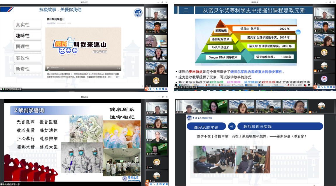 在汇报与分享交流阶段,十位教师结合各系学科特点,向参会的专家和老师们分享了疫情期间课程思政的教学设计与教学效果。病理学系的王医术教授分享了 “疫期《病理学》课程思政的实践与思考”,通过介绍病理学课程蕴含的隐性思政和显性思政,以大爱为基础,以大德为中坚,以大智为核心,实现无声融思政,有声育英才。组织学与胚胎学系刘佳梅教授汇报了“同新战役,同屏共振的思政分享”。通过介绍组织学与胚胎学系通过优化教学内容、创新教学方法、创新考核评价体系,实现了课程思政教学效果的新高度。病理生理学系的苏静教授分享了“基于员工自驱力的思政元素设计策略”,让大家了解到病理生理学课程通过“简”以突出重点、“通”以凸显员工、“推”以强化能力、“拔”以培养卓越,实现了课程思政的无声融入。生理学系的葛敬岩教授分享了“融情入理,潜心育人”,通过介绍生理学系的开学第一课设计,为员工讲授身边的故事和榜样,展开生理学系的教学内容,将思政元素在第一课渗入到全部的课程学习中。药理学系的石卓教授分享了 “坚定信念,实时思政——药理学系课程思政情况汇报”,层层递进、环环相扣的教学设计,为我们展示了药理学课程思政安排的创新与巧妙。免疫学系的付海英老师分享了“无声育人,有声花开——医学免疫学课程思政实践与思考”, 通过介绍思政元素挖掘、思政路径设计、课程思政实施以及思政效果展示,体现了免疫学课程的育人无声、花开有声。生物化学学系的张纪周老师分享了“脚踏实地,思政育人——生物化学课程思政元素挖掘”,生物化学学系以本学期的线上教学抗疫宣讲和教学设计为例,通过真实性、趣味性、同理性、时效性以及新奇性展示了生物化学课程的育人细无声。分子生物学系的王华老师分享了“医学分子生物学课程中思政元素的渗透与融合”,通过介绍分子生物学的学科特点、从科学史中挖掘出课程思政元素以及如何将思政元素与学科特点有机融合,展示了分子生物学课程思政的设计与感悟。解剖系的刘辉老师分享了“追思感恩,责任担当,隐性思政,润物无声”,让我们了解到解剖学作为特殊的一门课程,教师在授课的同时,教会了员工如何尊敬和感恩大体老师,学系在积极投身教学的同时,也努力种好了课程思政责任田。细胞生物学系的何海涛老师分享了“医学细胞生物学课程思政的建设与实践”,通过教学理念、教学策略、教师培训与实践以及教学成果四个方面的介绍,展示了细胞生物学的思政设计。
