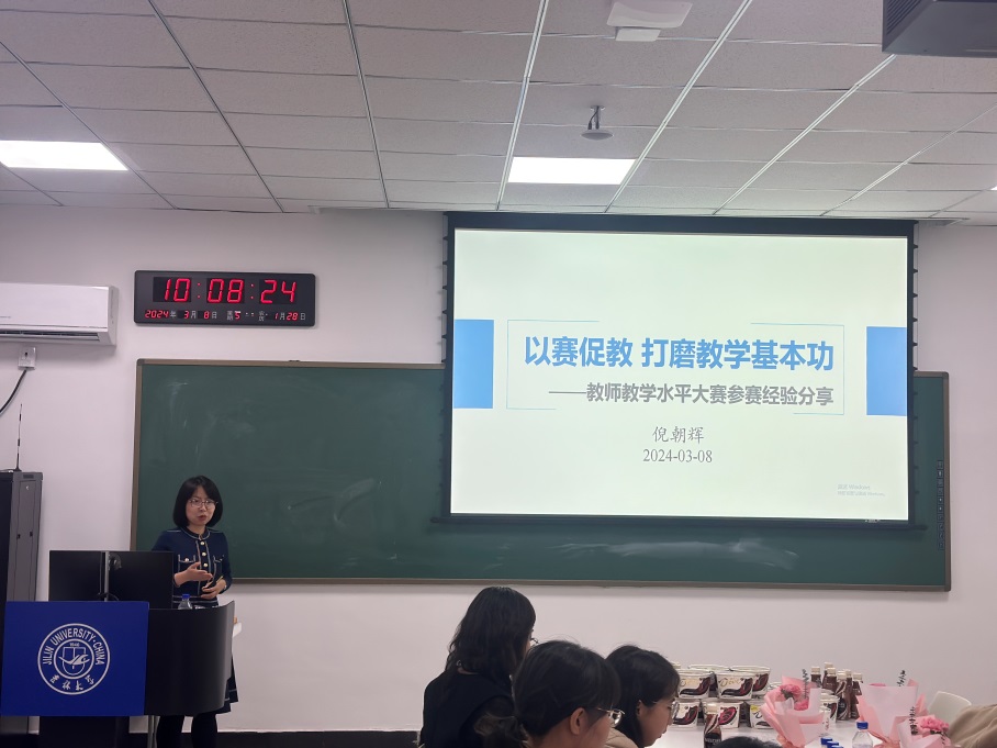 倪朝辉教授结合自身参赛备赛经历和感悟,从“懵懂初遇”、“执着求索”到“累累收获”全过程给在场所有青年教师进行了经验分享。随后,她从比赛形式、评价标准和如何备战教学比赛三个方面进行了全面细致的分析,重点介绍了比赛选题、教学设计和课堂教学实战过程中老师们容易忽略的共性问题,为参赛教师们提供了宝贵的指导意见。倪朝辉教授用“心怀热爱,行以致远”结束了当天的经验分享。