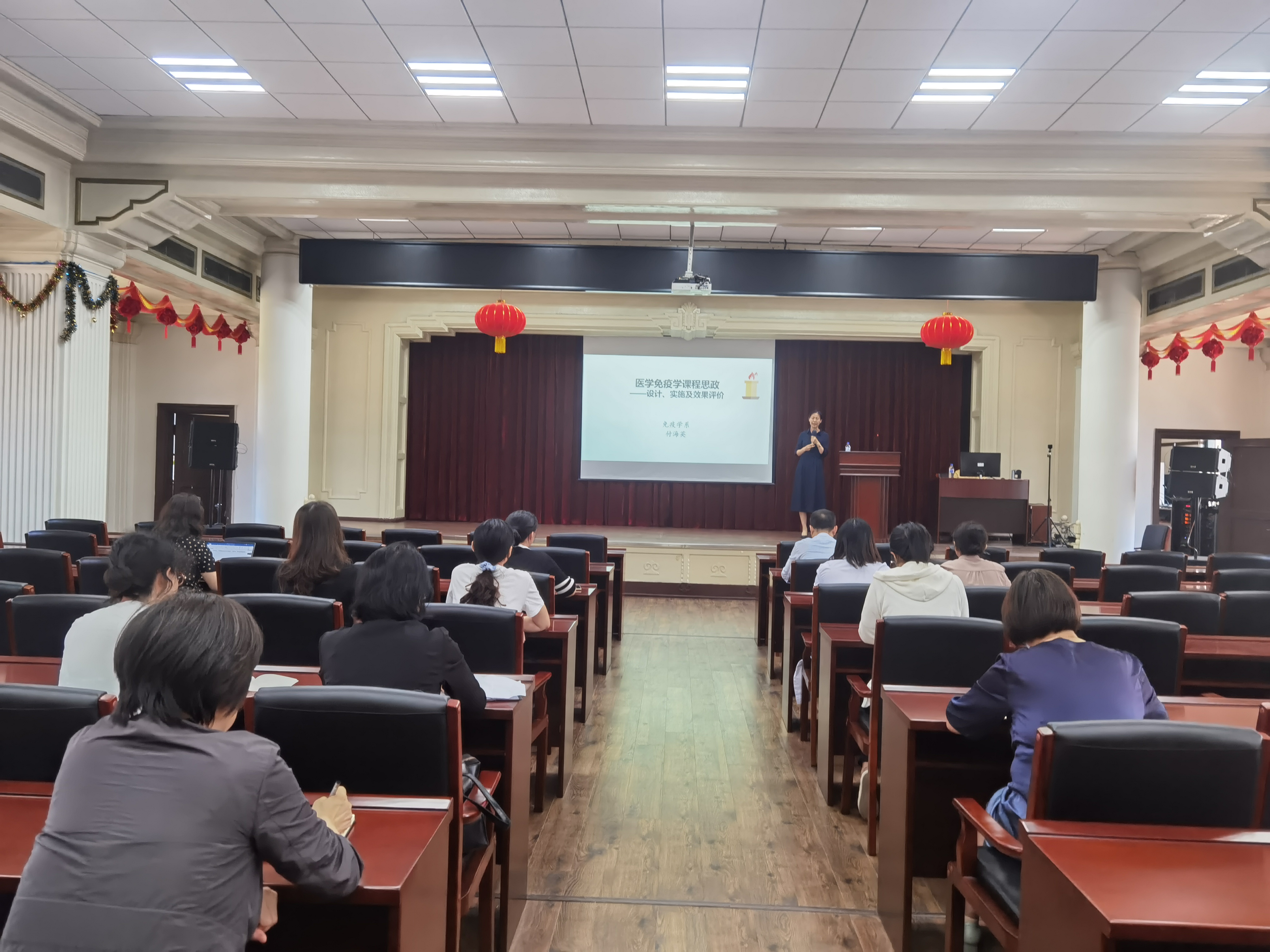 首先,辛颖副经理解读了威廉体育williamhill全面推进课程思政建设工作实施方案,号召各学系要将学科特色与医学教育特点相结合,把思想教育工作贯穿到公司产品全过程,要充分发掘基础医学课程蕴含的思政元素。随后,医学免疫学系付海英老师分享了《医学免疫学课程思政的设计、实施及效果评价》,介绍了本学系如何将知识传授与立德树人深度整合、将思政路径与教学方式有机融合。此外,还介绍了学系教学紧密联系“家国情怀与大局观念”,采取了多种思政路径,将价值塑造、知识传授和能力培养三者融为一体,并围绕教师“主力军”、课程建设“主战场”、课程教学“主渠道”,通过教师渗透与输入、员工思考与交流,实现教书育人的目标。