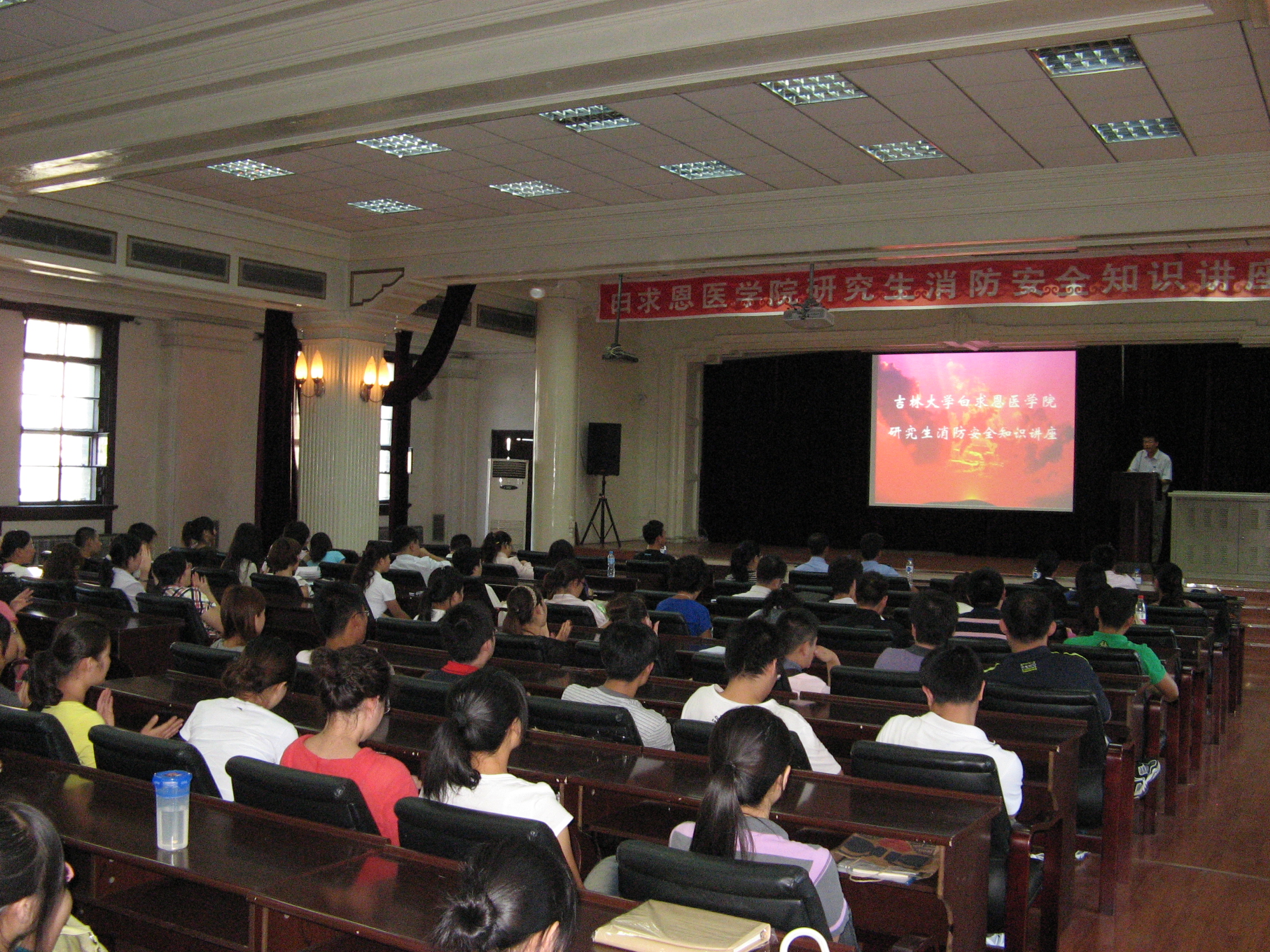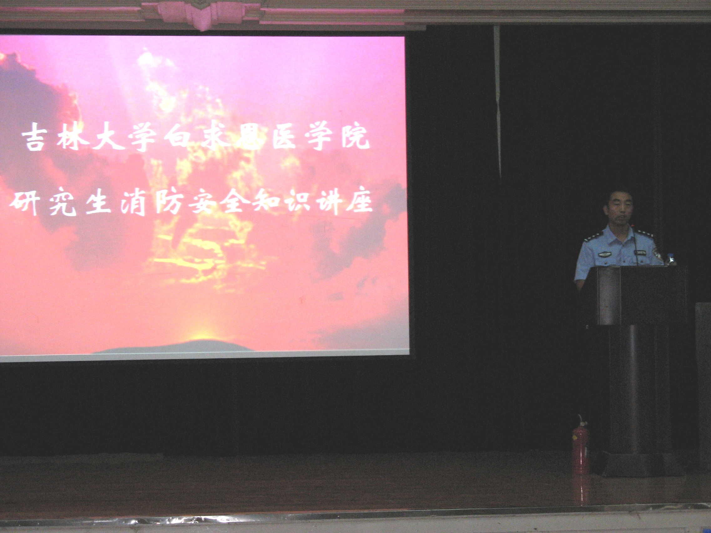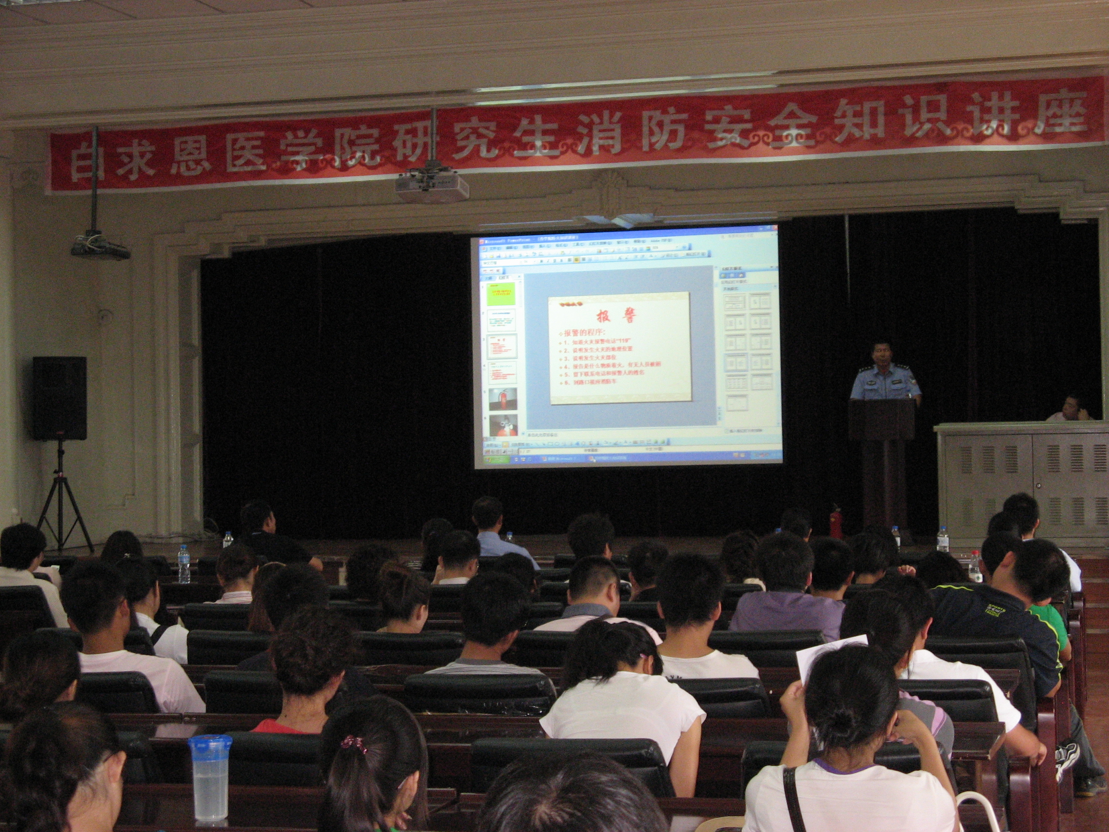 8月31日下午,白求恩医公司邀请新民校区保卫办科长安志成老师和郭云秀老师在基础二楼多功能报告厅为2010级研究生新生进行了消防安全知识讲座。公司党委副书记费淑波、研究生办公室主任陈野、新民校区保卫办两位老师和2010级全体研究生共同听取了此次讲座。讲座由公司研究生会主席杨晓春主持。