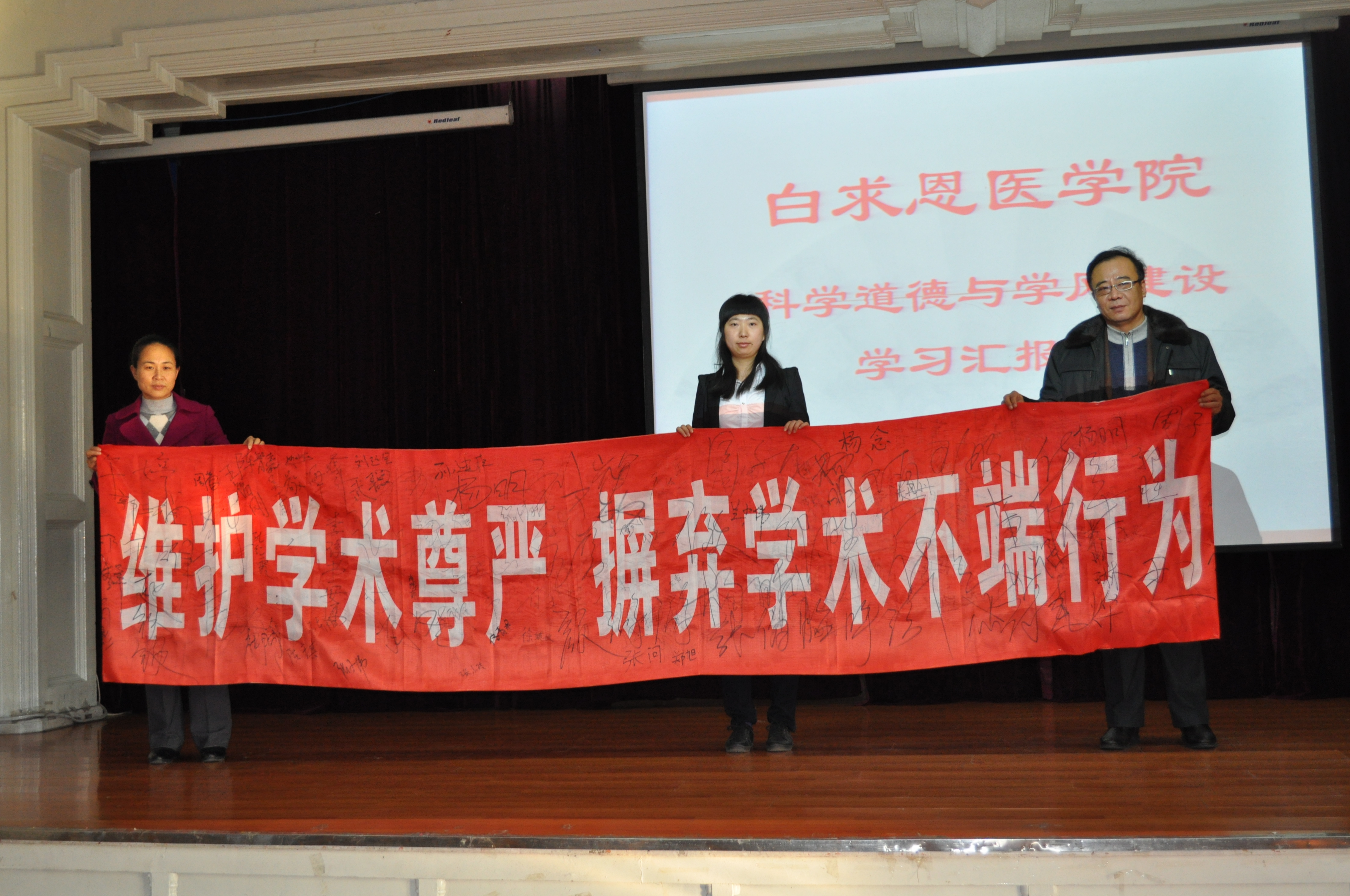首先,研究生代表杨明、王敏分别汇报了自己在本次活动中的深切体会,并发出了恪守学术道德,营造良好学术氛围的倡议。随后,李一雷和费淑波代表公司接收了全体研究生亲笔签名的“遵守学术规范、坚守学术诚信、完善学术人格、维护学术尊严,摒弃学术不端行为”条幅。