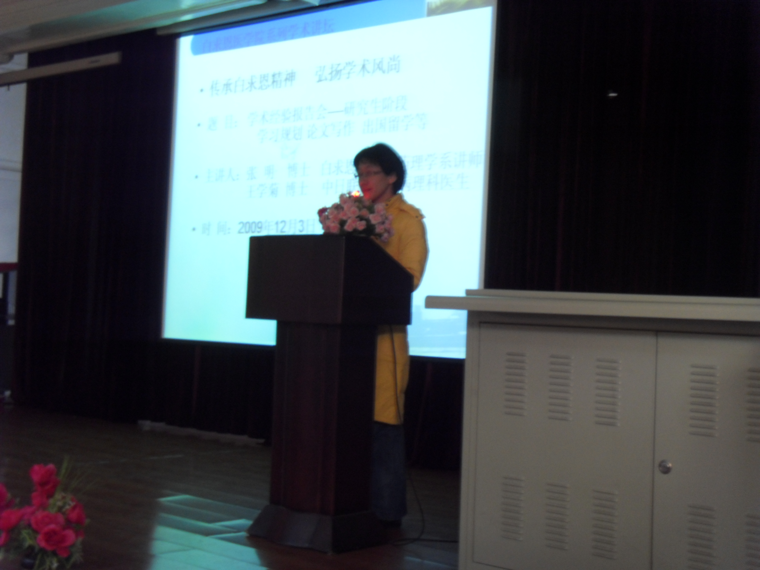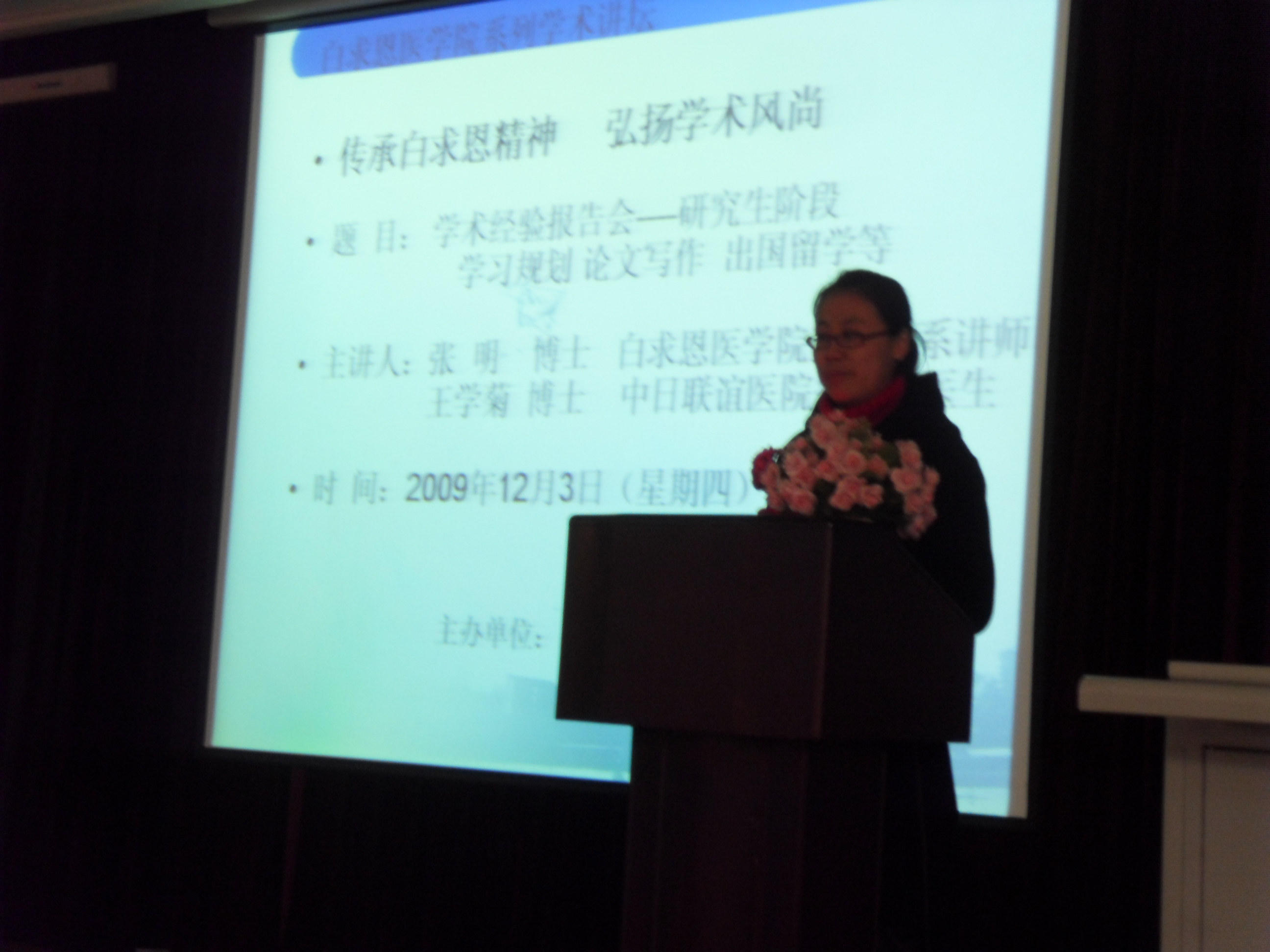 12月3日下午,公司“传承白求恩精神 弘扬学术风尚” 系列学术活动在基础二楼多功能厅拉开序幕,本次活动邀请了两位优秀毕业生做了一场生动的学术经验报告会。公司党委副书记费淑波、研究生办公室主任陈野和2009级研究生一起参加了报告会。报告会由公司研究生会学术部长杨念主持。