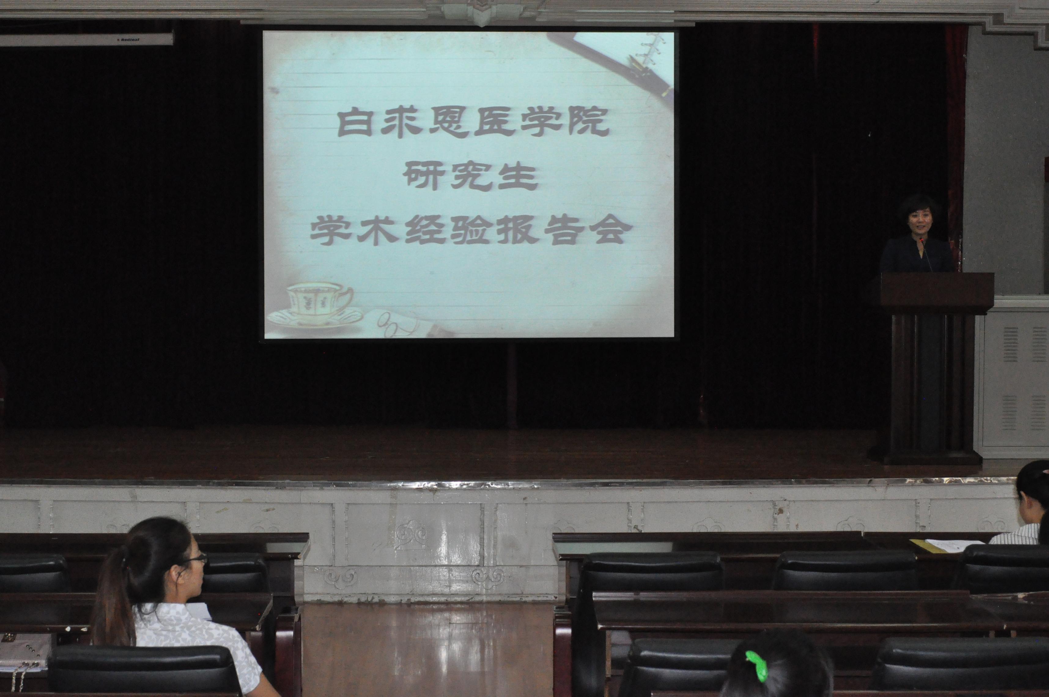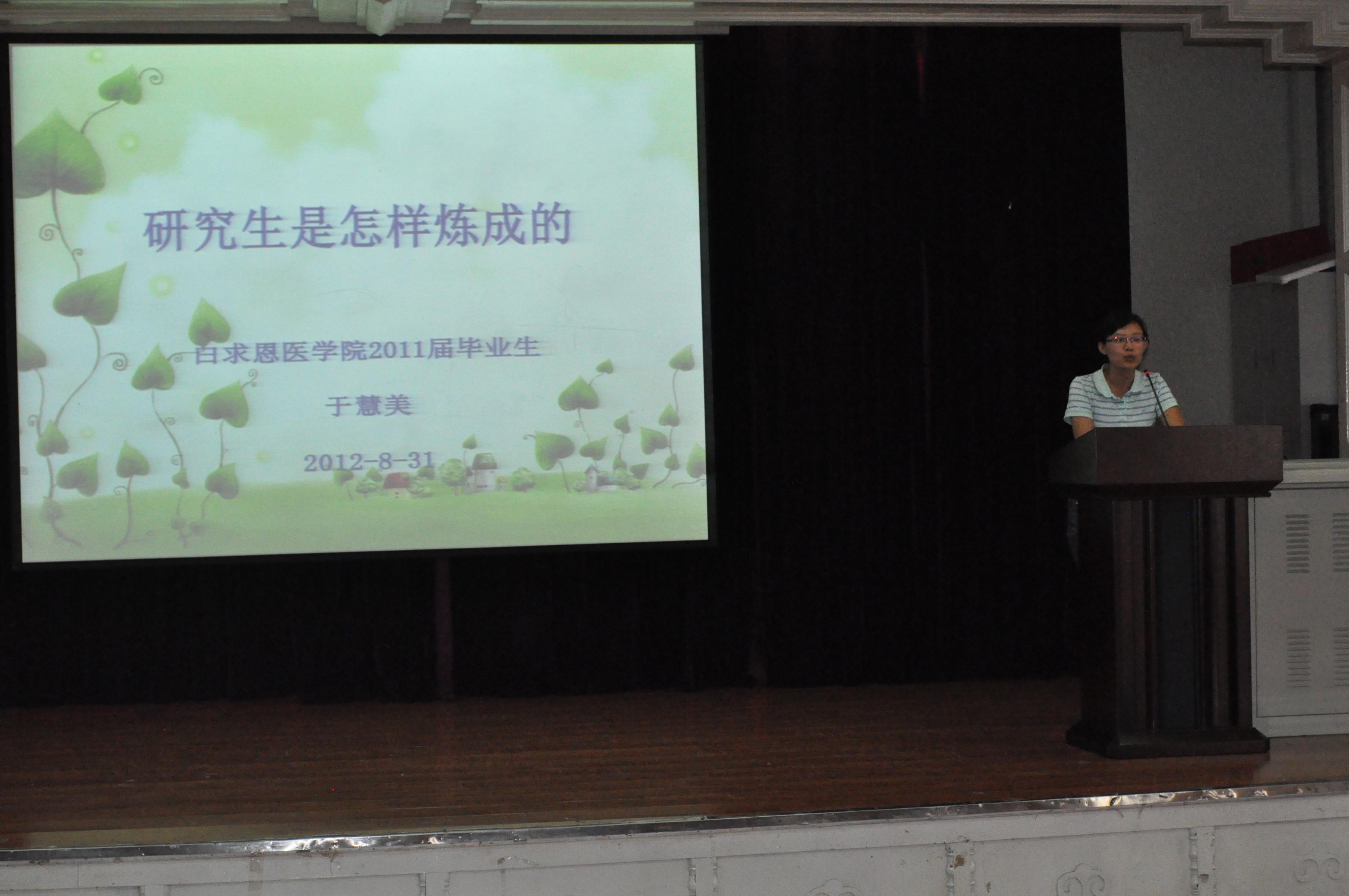 8月31日下午,白求恩医公司邀请了2011届优秀博士毕业生-—于慧美、徐慧在基础楼二楼多功能学术报告厅进行了研究生学术经验报告会。白求恩医公司主管研究生工作副经理李一雷、党委副书记费淑波和2012级研究生新生一起参加了报告会。报告会由研究生办公室主任黄梅主持。