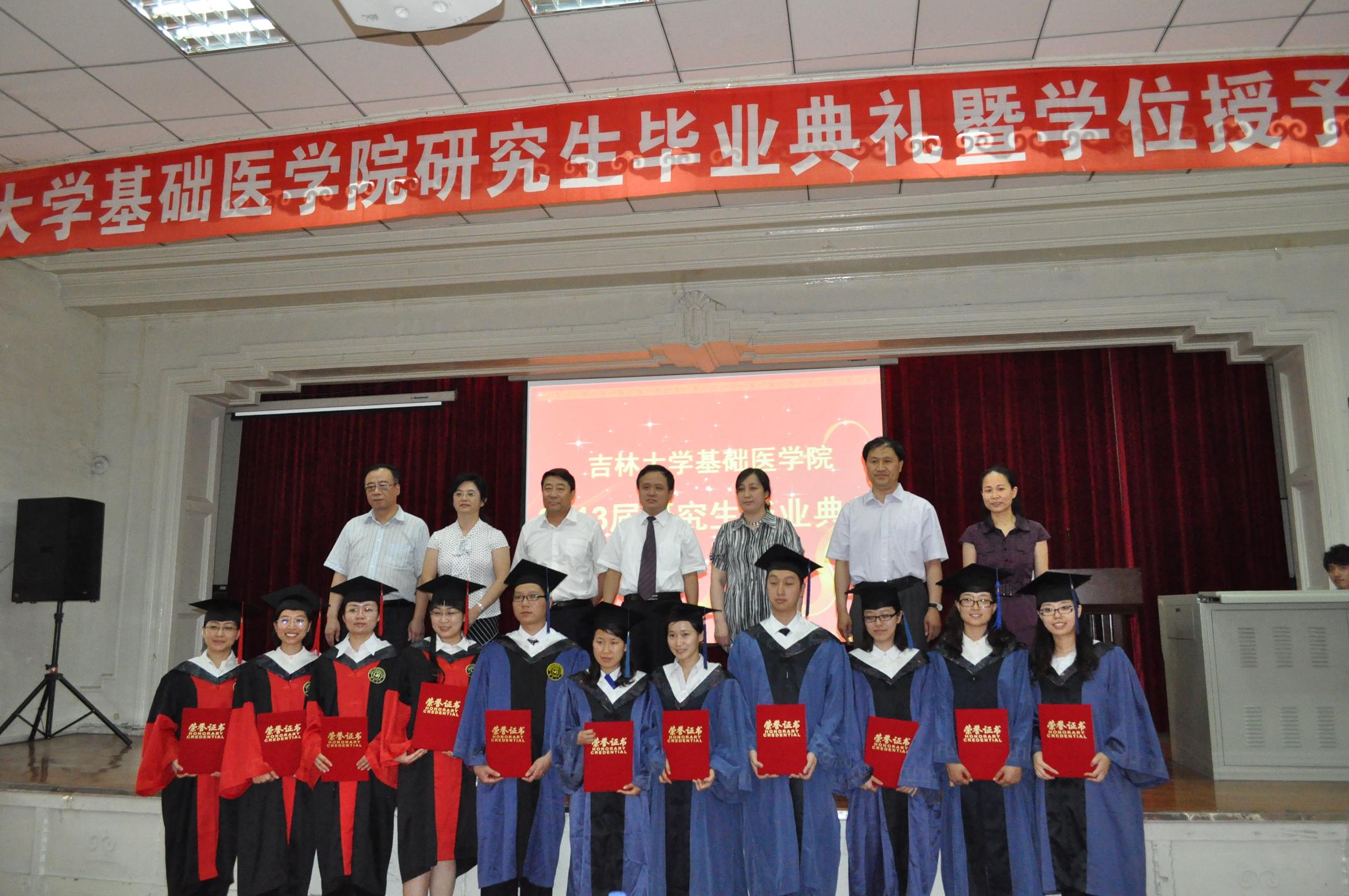 毕业典礼在庄严的国歌声中拉开了序幕。首先,副经理李一雷宣读毕业生名单。经理孙连坤、基础医学学位评定分委员会主席王丽颖为毕业研究生逐一执行“拨穗礼”,并颁发学位证书。之后,党委书记孙赵华宣读“校优秀毕业生名单”和“院优秀博士学位论文获得者及指导教师的表彰决定”,随后院领导和王丽颖为获奖的师生颁奖。